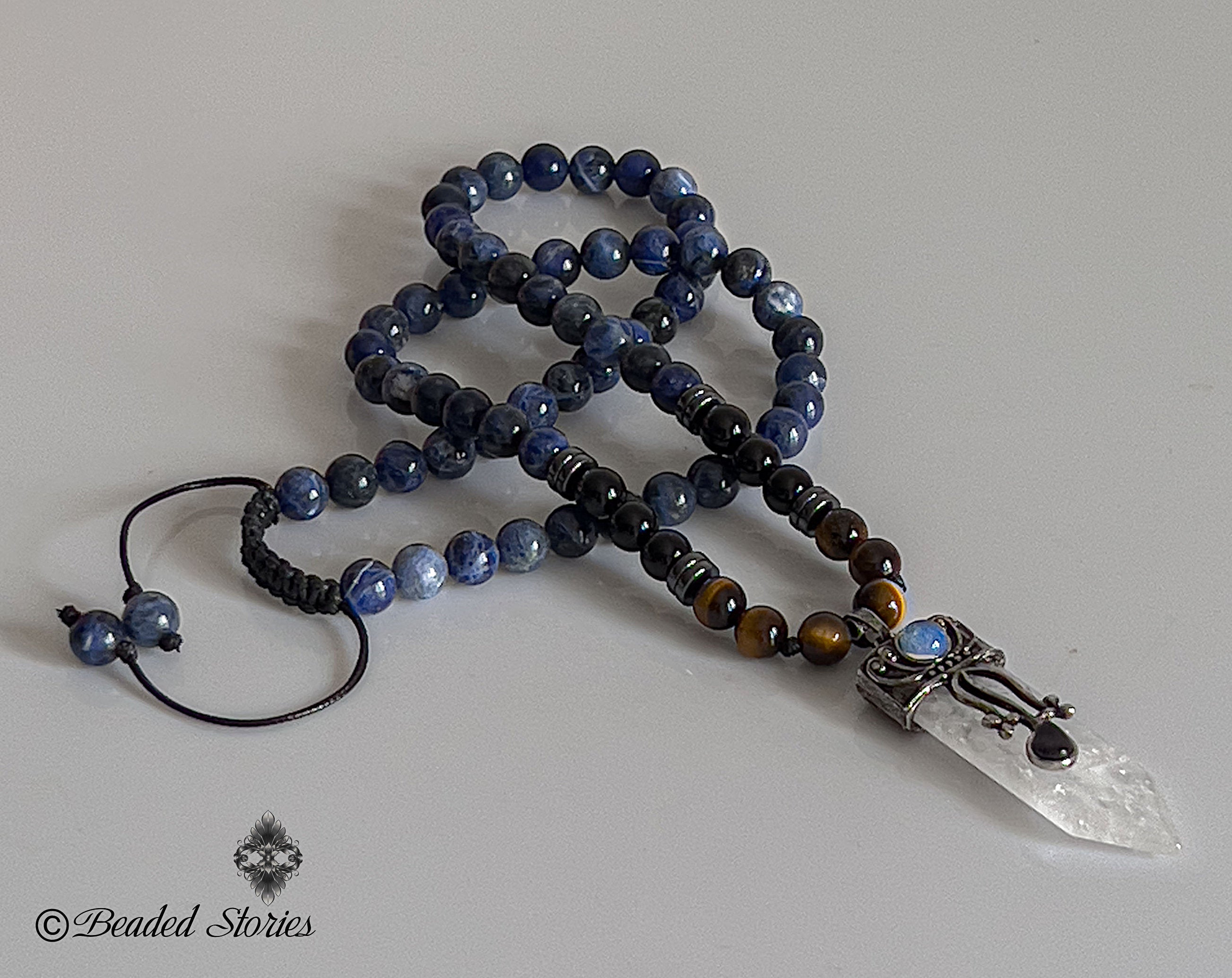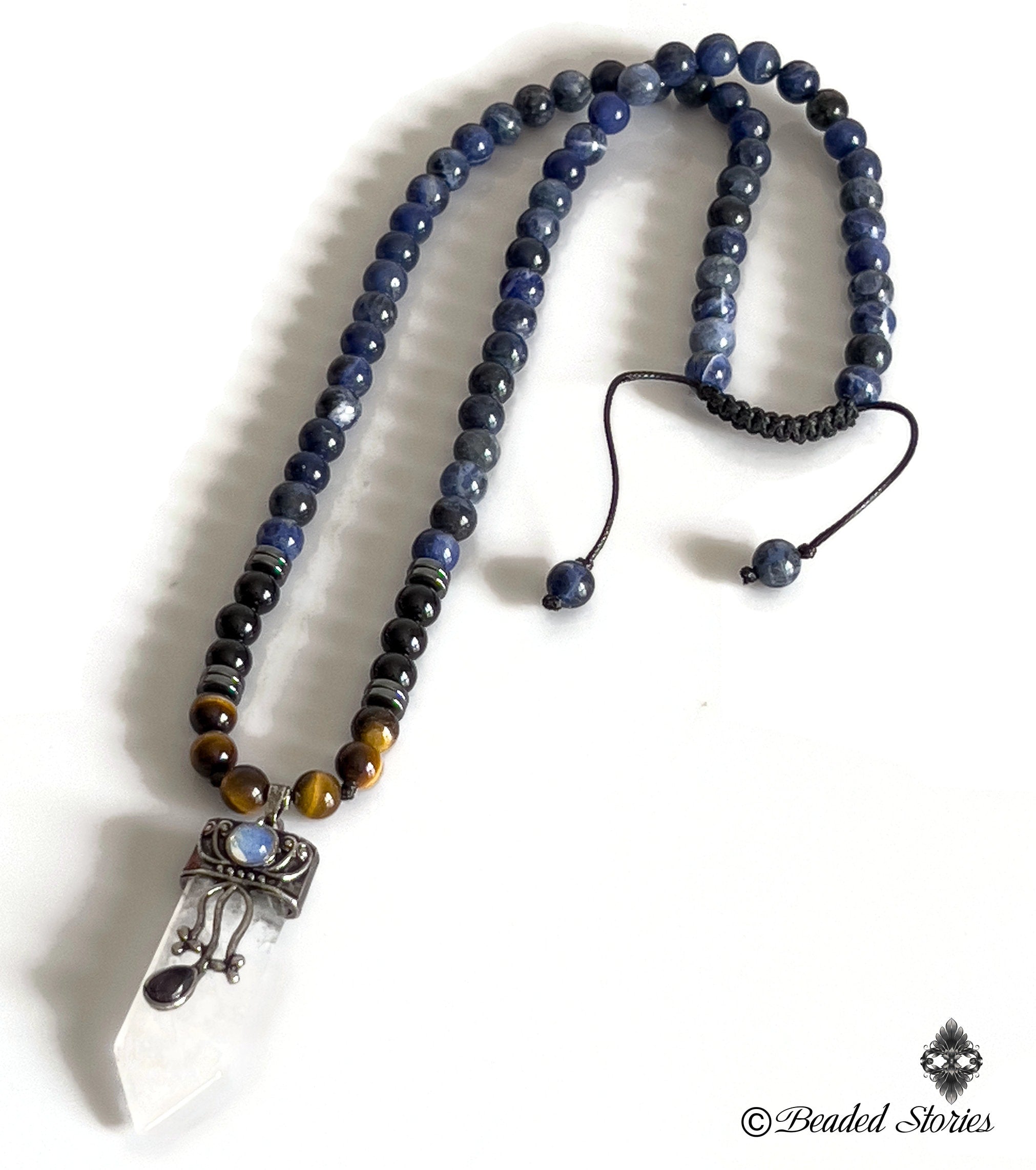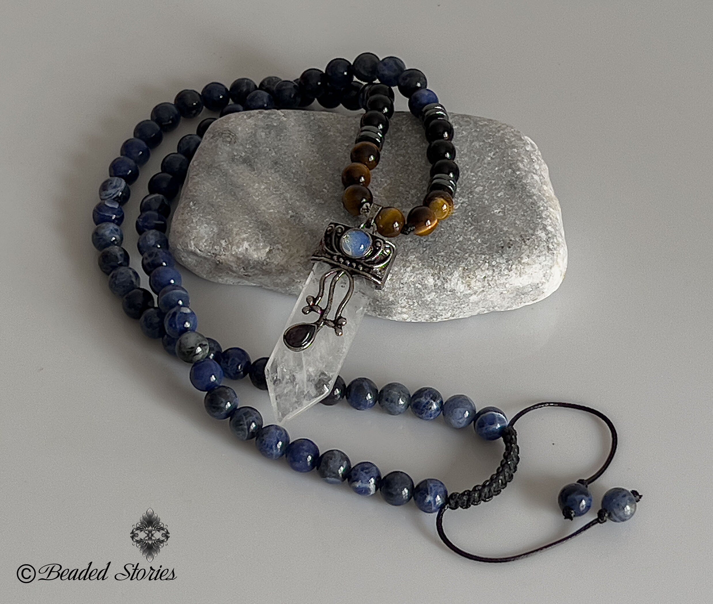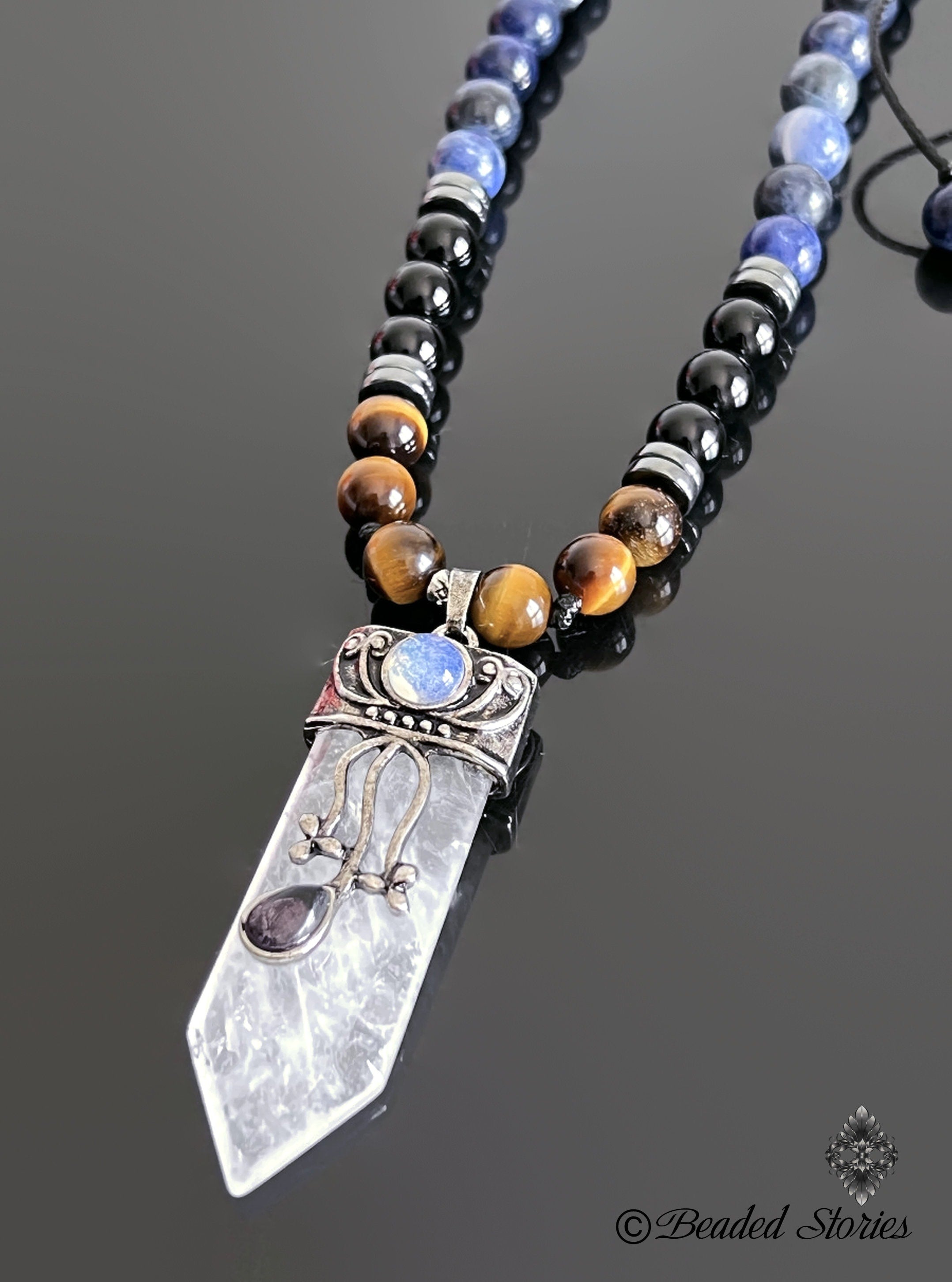 - Discover the power of our April Birthstone Necklace, featuring a stunning Crystal Quartz point pendant as its centerpiece. This long beaded necklace is meticulously handcrafted with 8 mm Tiger's Eye, Black Onyx, Hematite, and Sodalite gemstone beads, all strung on a durable waxed cord.