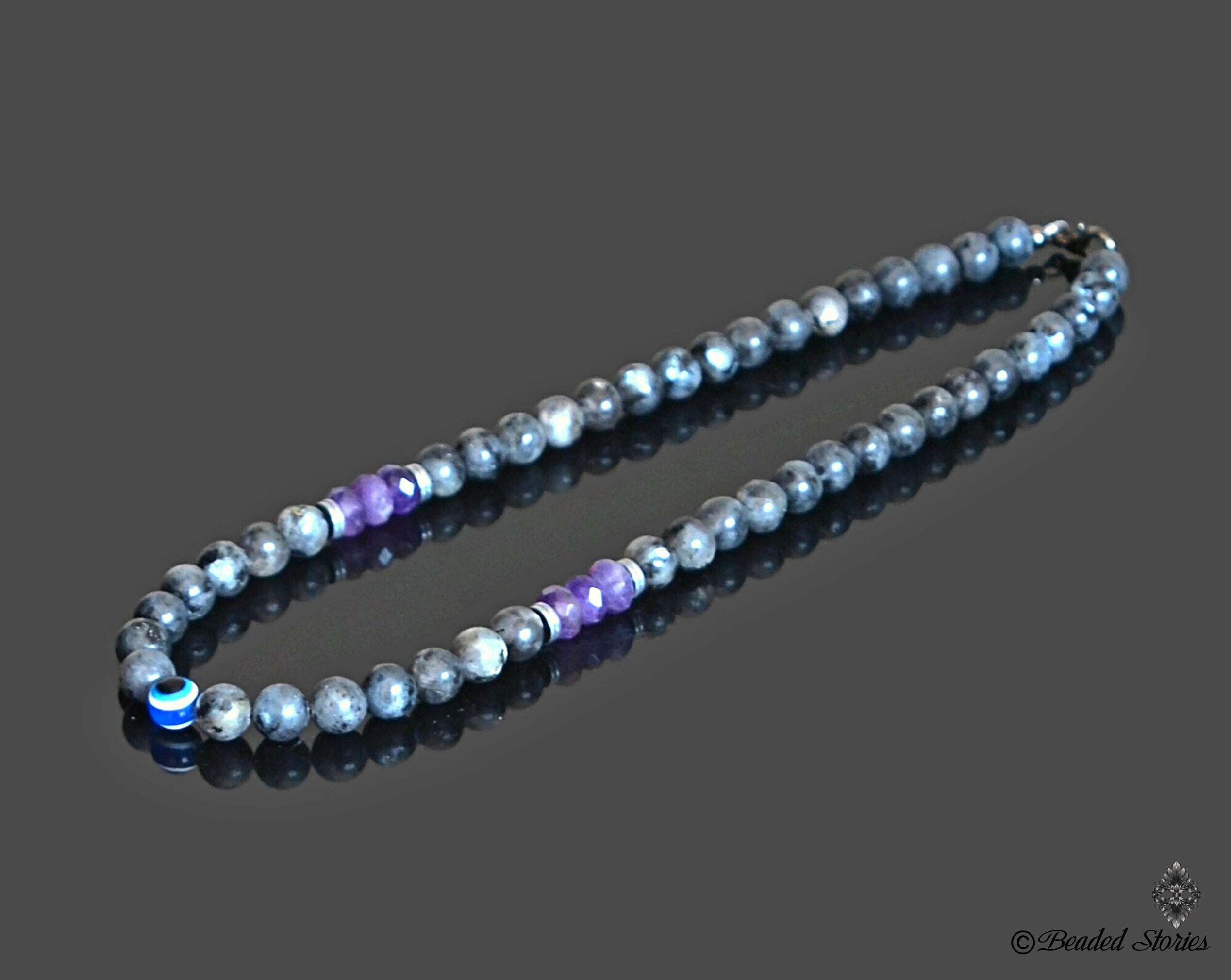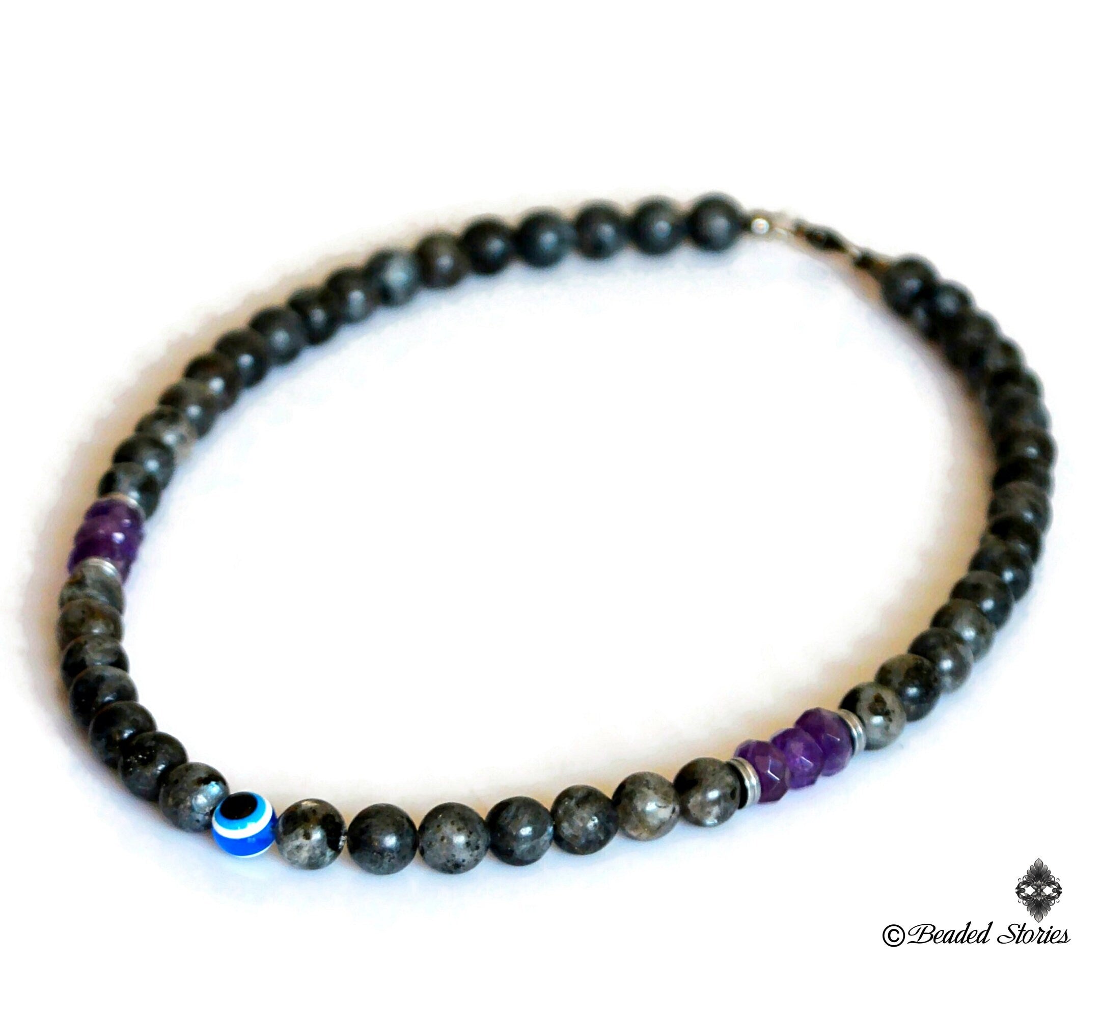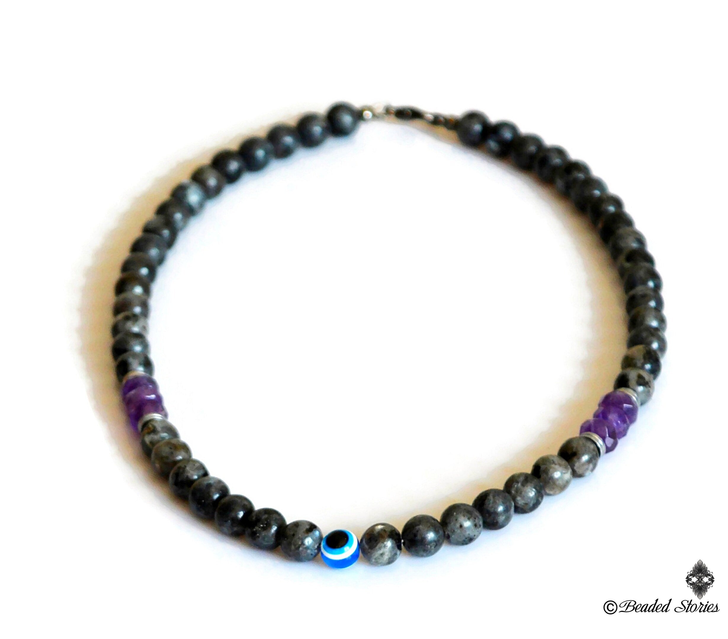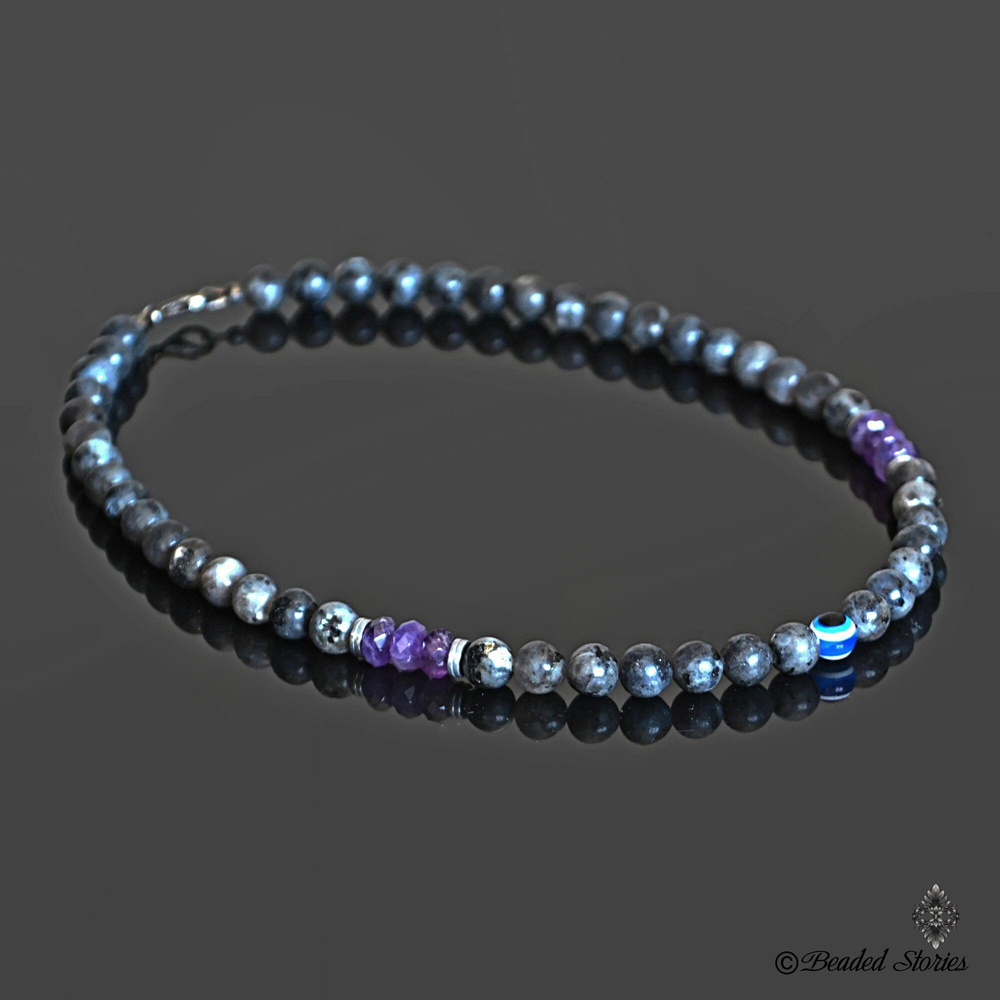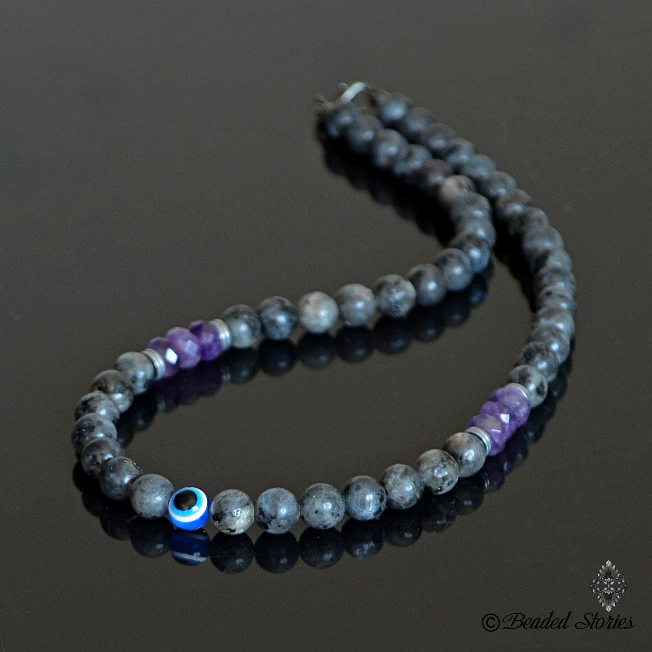 Amethyst Labradorite Beaded Necklace, Evil Eye Protection Necklace for Men, February Birthstone Jewelry, Protection Amulet Choker Necklace, Handmade Jewelry Birthday Gift by Beaded Stories