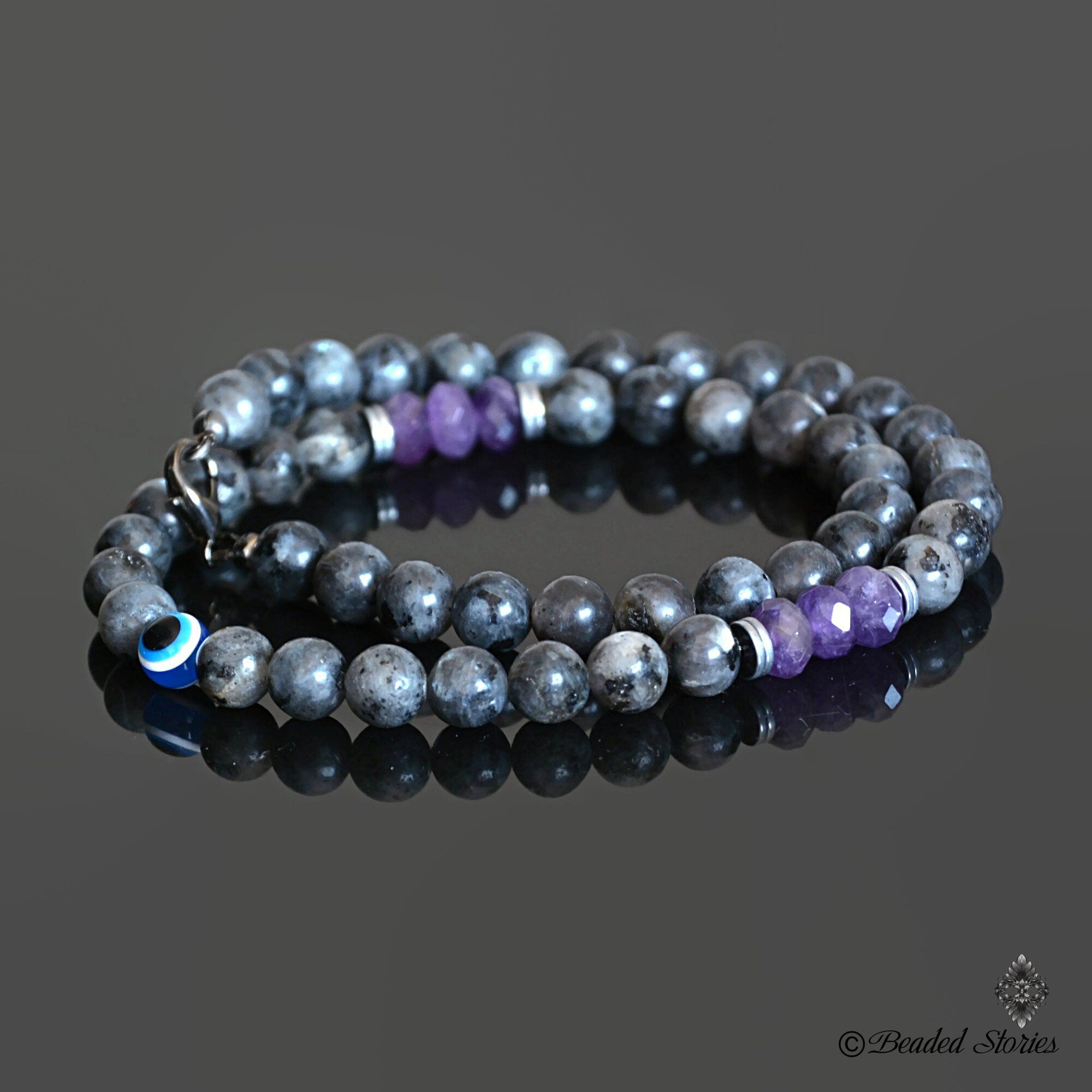 Introducing a men's Evil Eye necklace handcrafted by Beaded Stories using 8 mm Labradorite beads, featuring stunning faceted Amethyst and... Read more