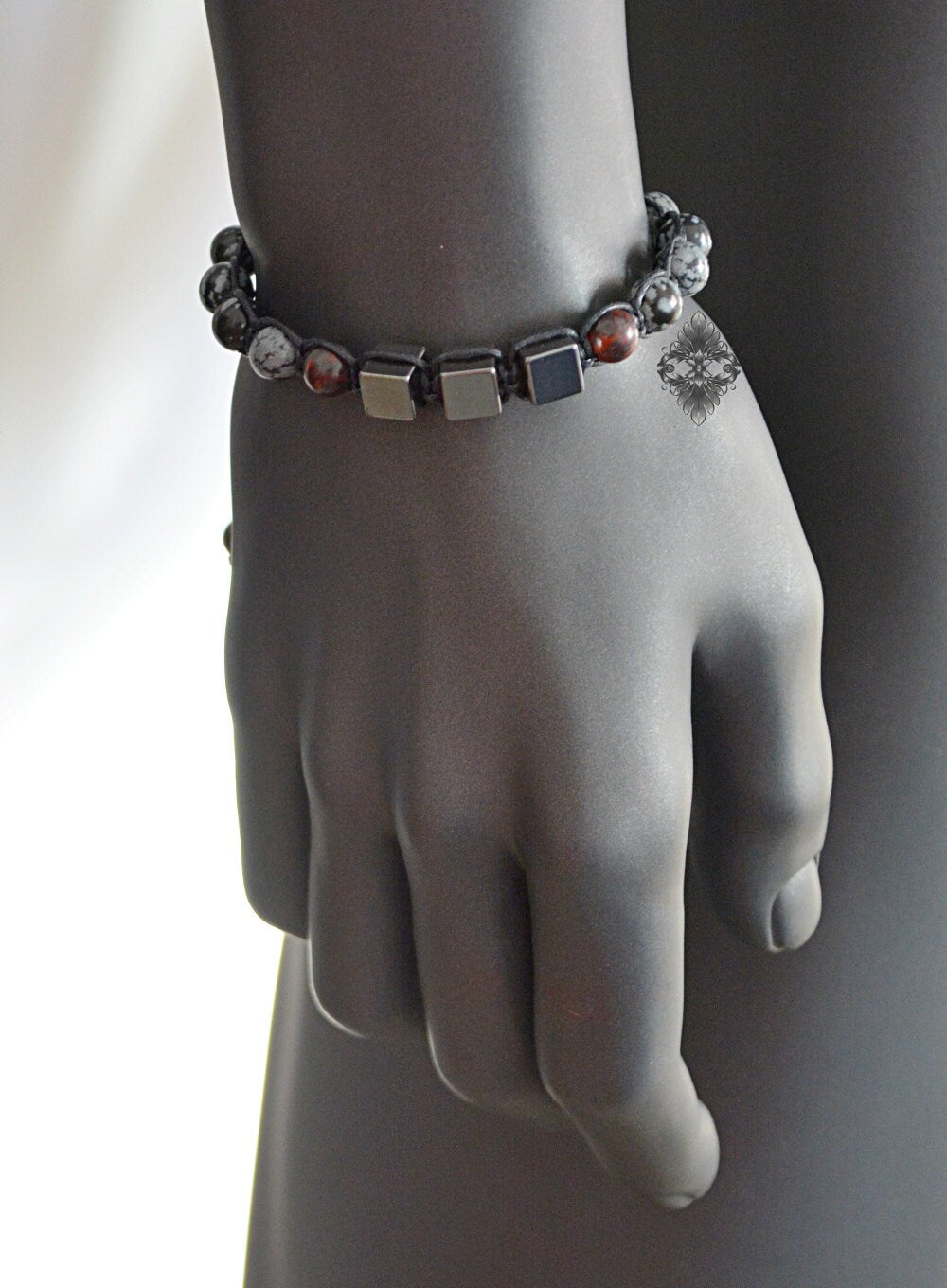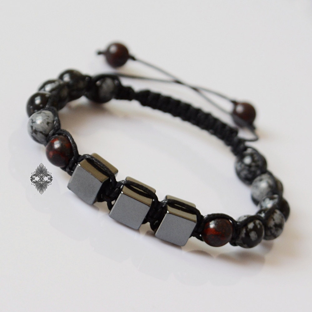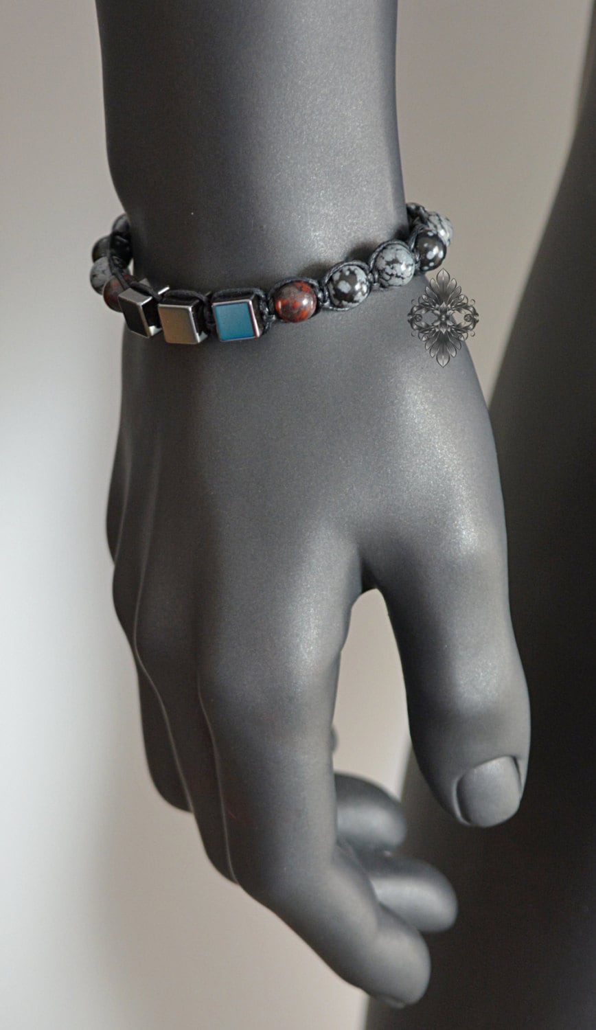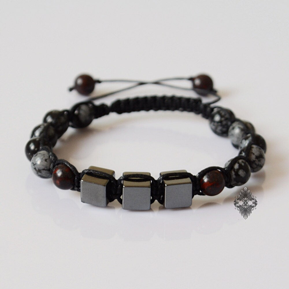 Add a bold, masculine touch to your style with this handcrafted natural gemstone beaded bracelet. Designed with three Hematite cube beads as the centerpiece, this bracelet combines natural Bloodstone and Snowflake Obsidian 8mm beads for a stylish and meaningful accessory. Strung on a durable waxed cord and finished with an adjustable sliding knot closure, it ensures a comfortable fit for any wrist.