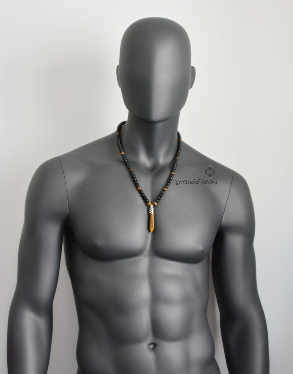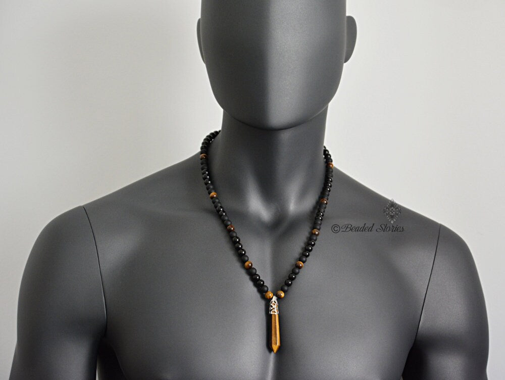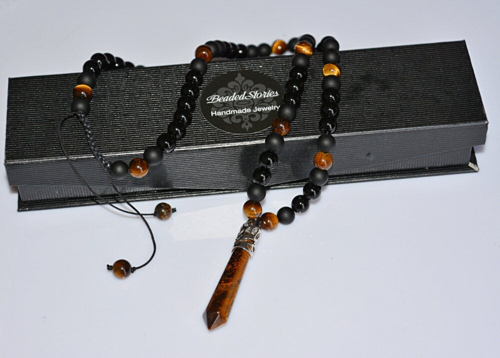Long men's pendant necklace, Black Onyx & Tigers Eye, Handmade crystal jewelry