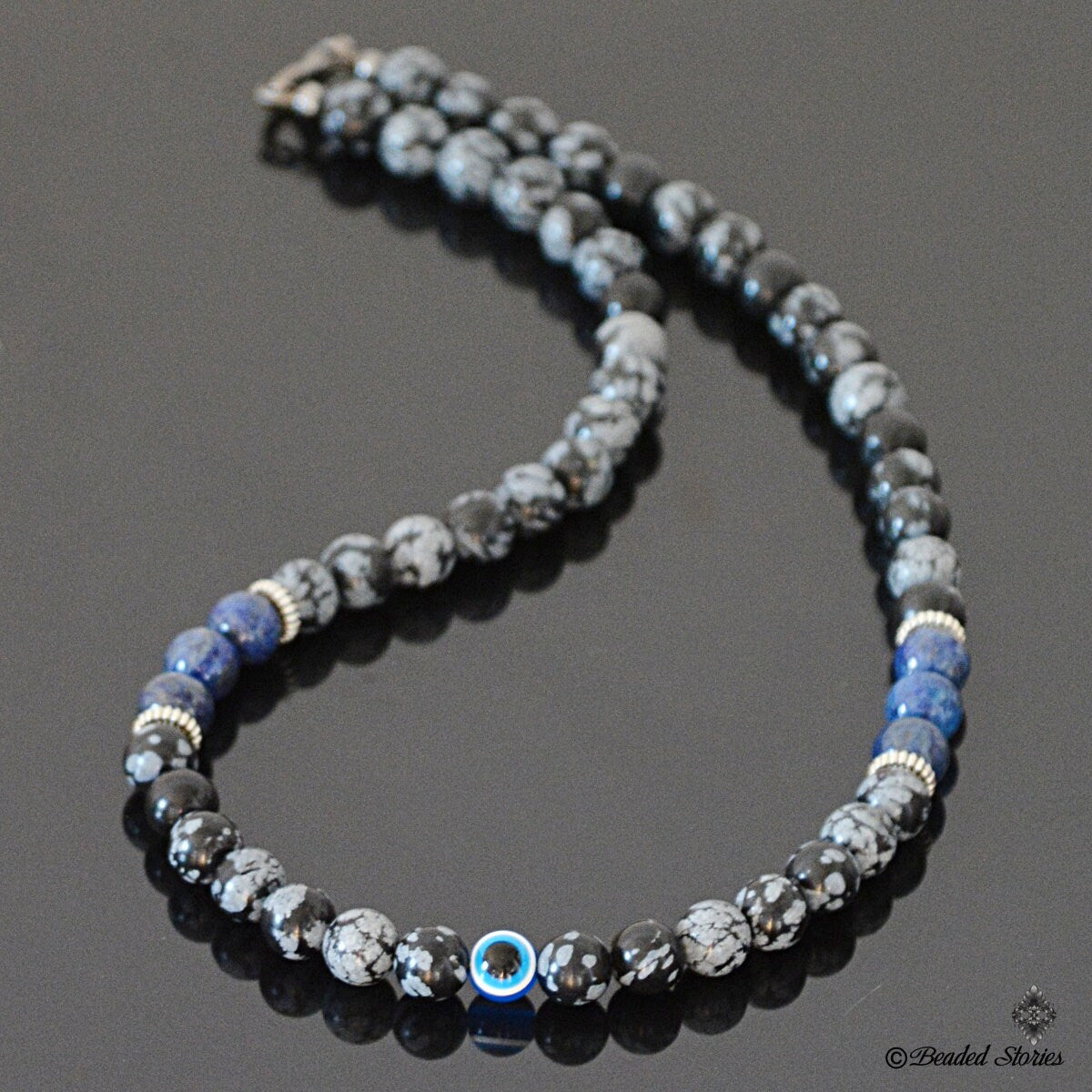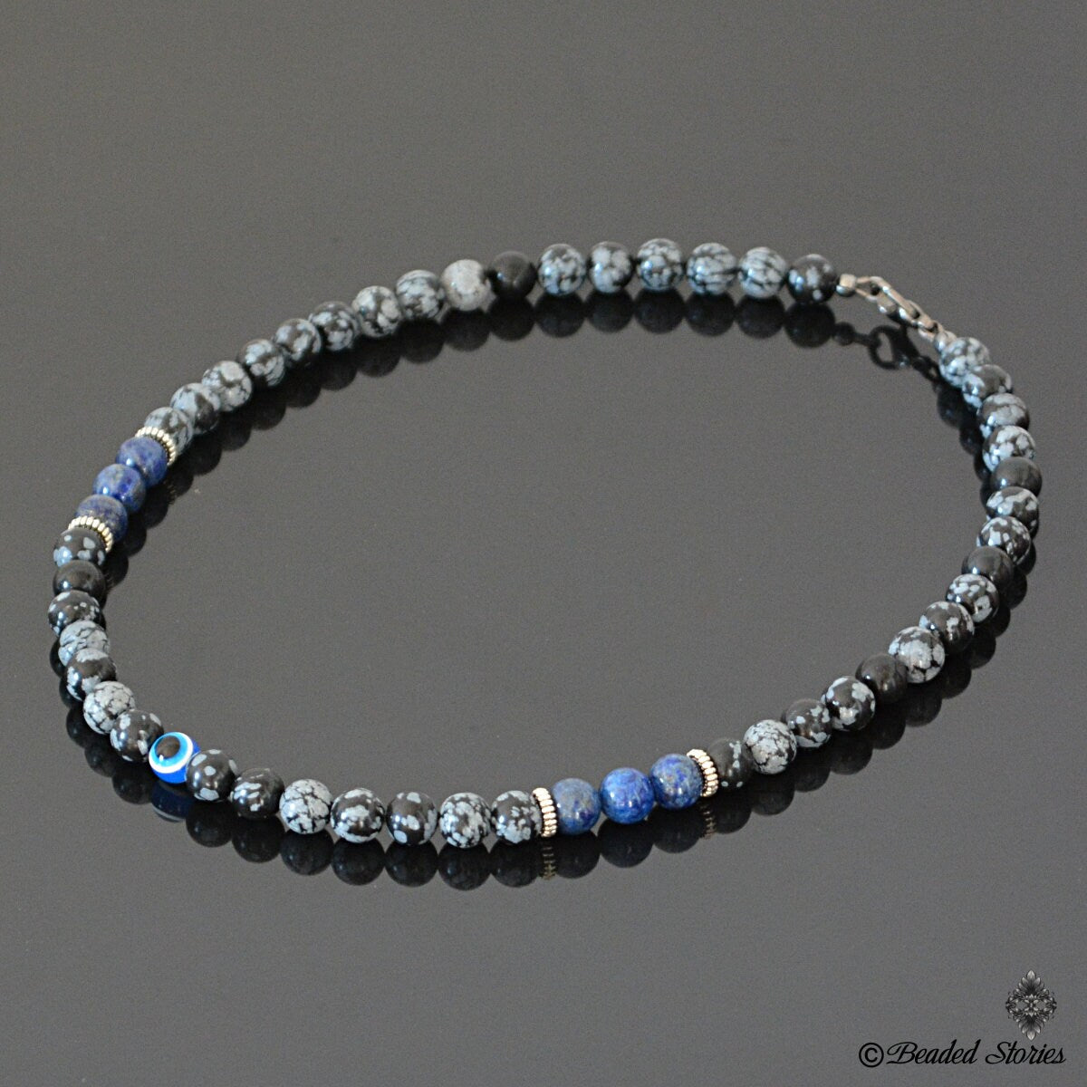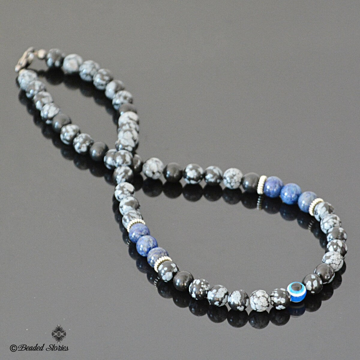 Men's Evil Eye Necklace, Lapis Lazuli & Snowflake Obsidian Beaded Choker, Protection Jewelry for Him