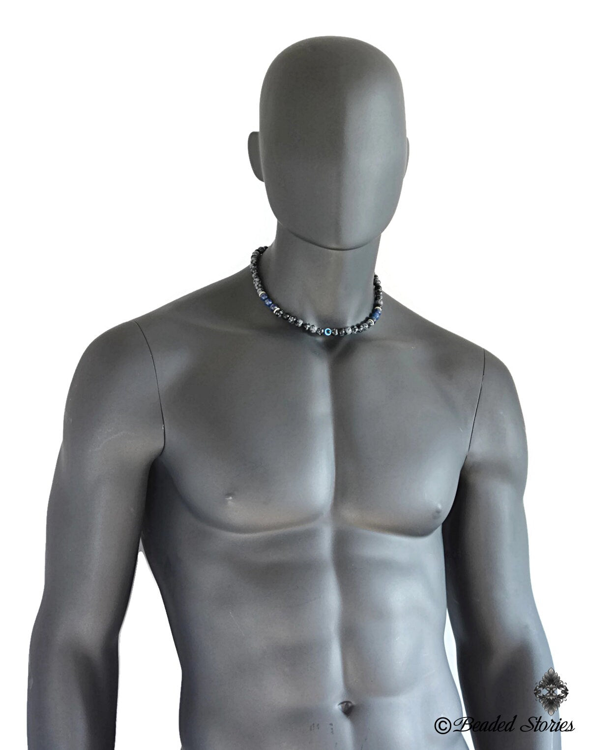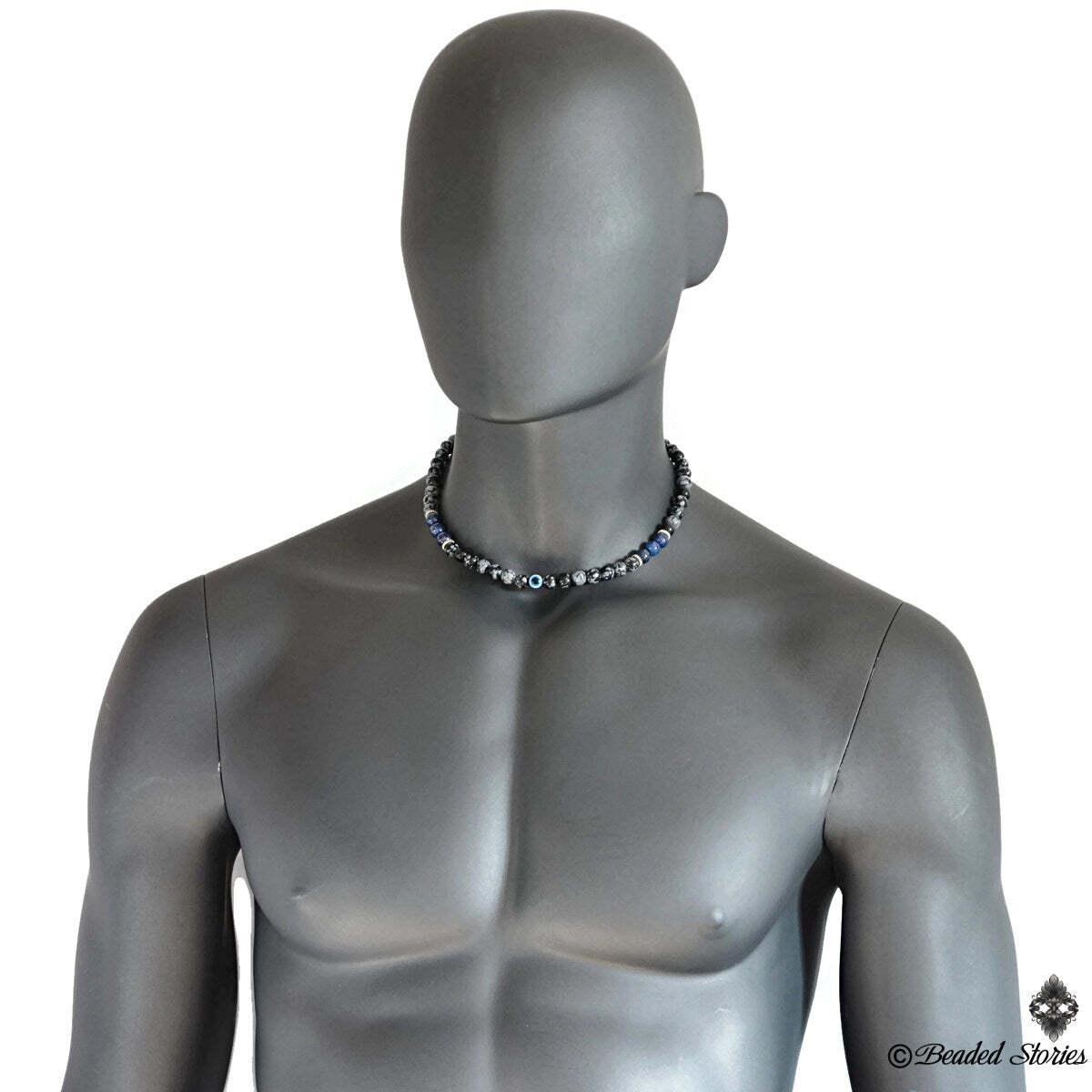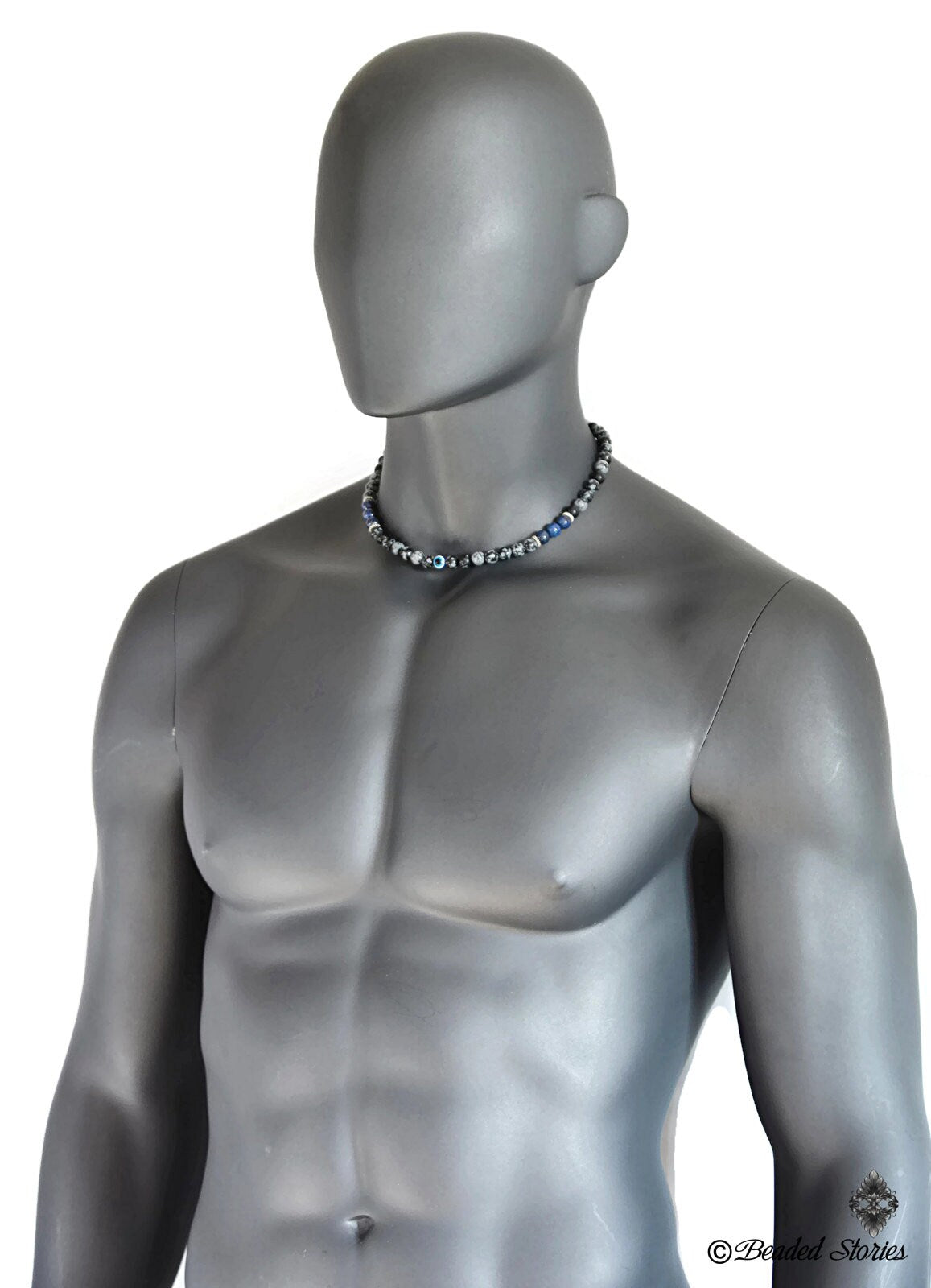 Men's Evil Eye Necklace, Lapis Lazuli & Snowflake Obsidian Beaded Choker, Protection Jewelry for Him