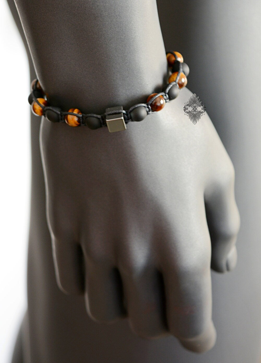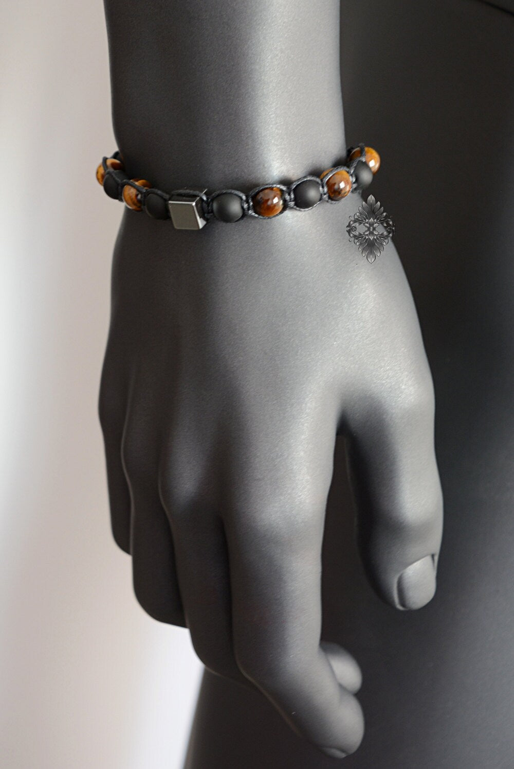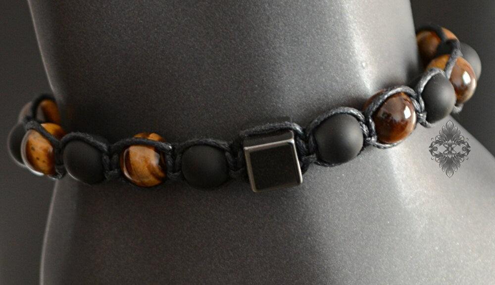 Men’s Gemstone Beaded Bracelet, Tiger’s Eye, Black Onyx & Hematite, Adjustable Handmade Bracelet, Protective Crystal Jewelry Gift for Him
