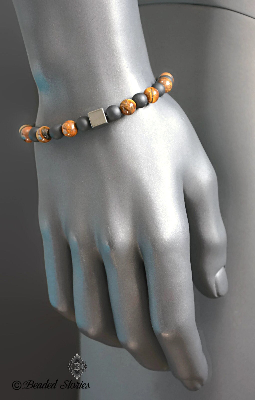 Surprise him with a meaningful and stylish July birthstone gift with this healing crystal bracelet for men. Designed with a natural Hematite cubic bead and a blend of Tiger’s Eye and Black Onyx round beads, this bracelet is a powerful symbol of protection, strength, and prosperity. Finished with a secure lobster claw clasp, it’s a versatile piece that can be worn alone or stacked with other gemstone bracelets.