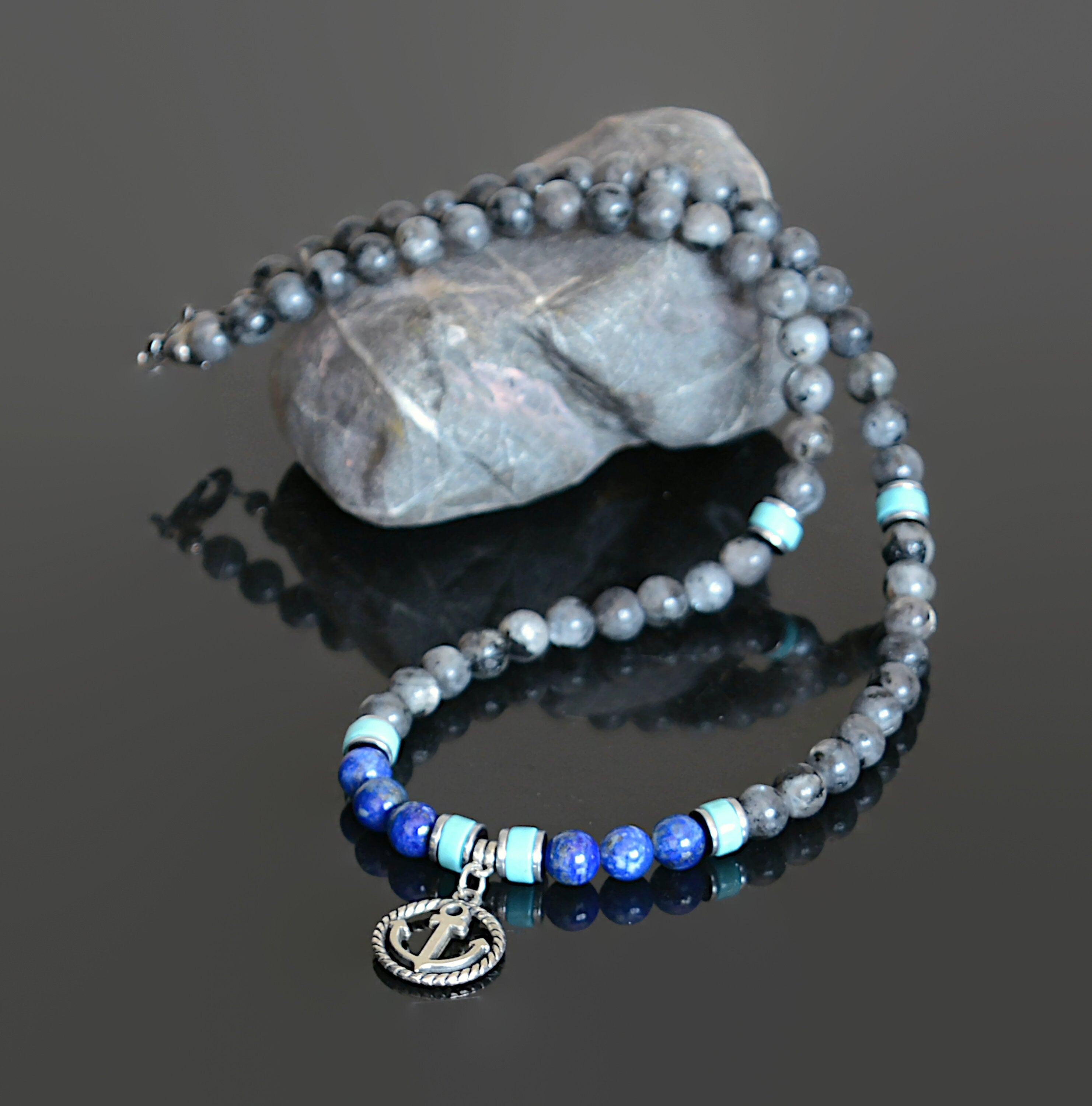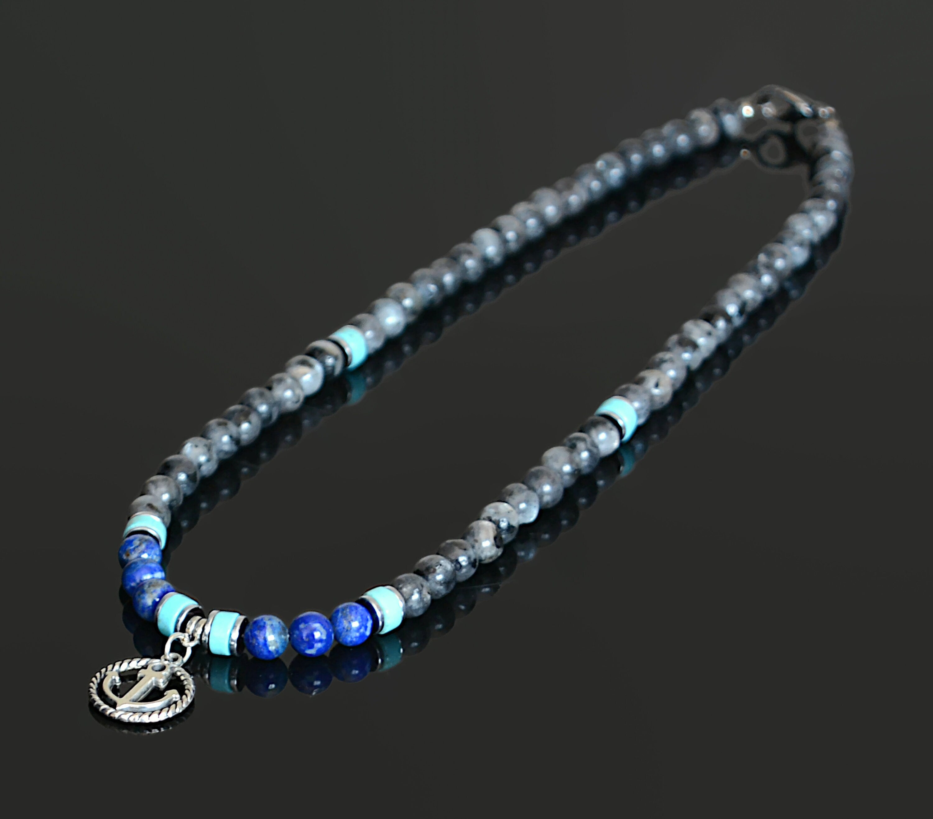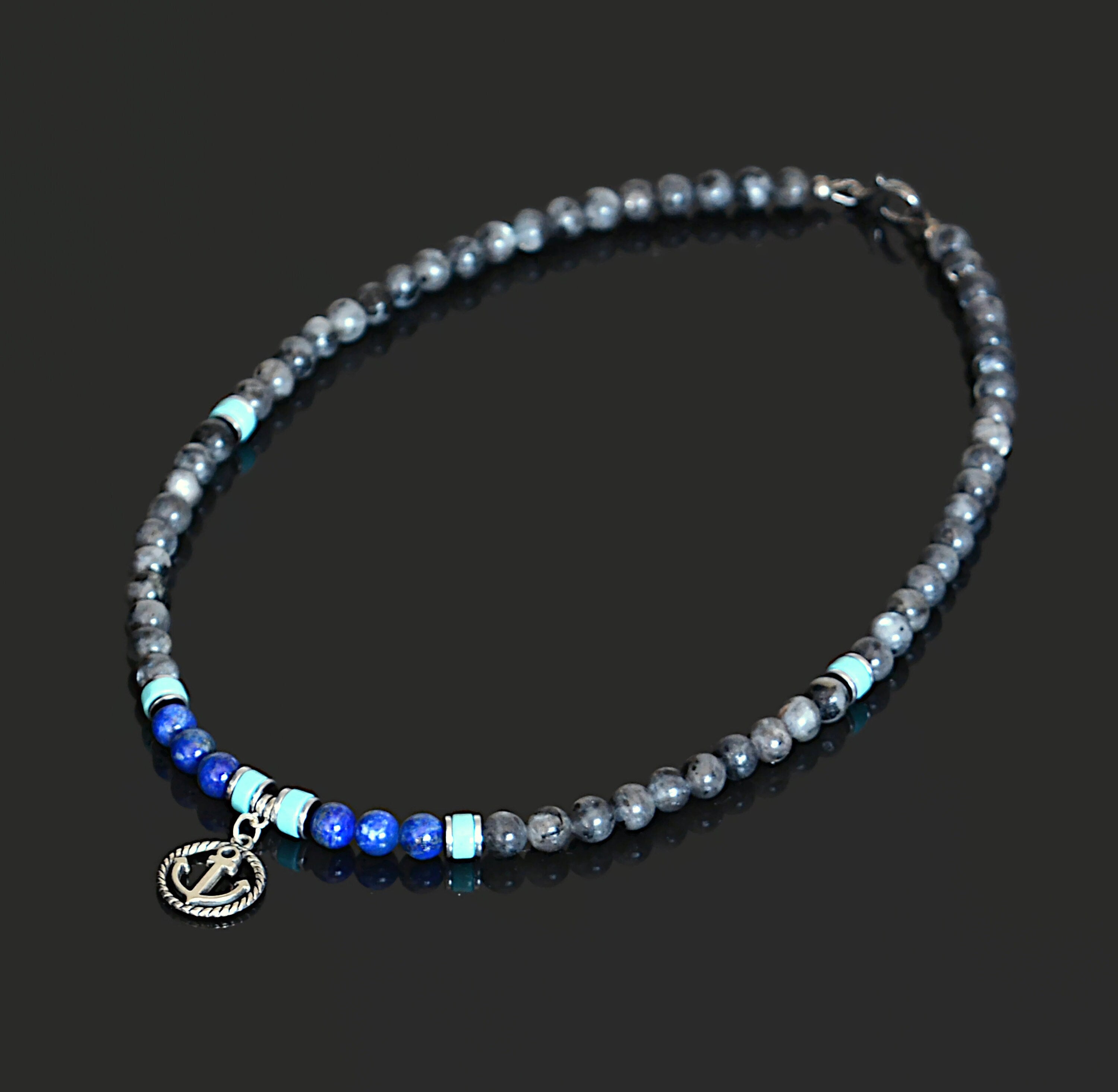 The necklace is accented with a nautical anchor charm and handcrafted with carefully selected beads in two shades of blue and a mystical gray, creating a bold yet refined coastal look. Whether you're drawn to its symbolic meanings, ocean-inspired style, or natural beauty, this necklace makes a thoughtful and meaningful gift for any man—especially for birthdays, holidays, or other special occasions.