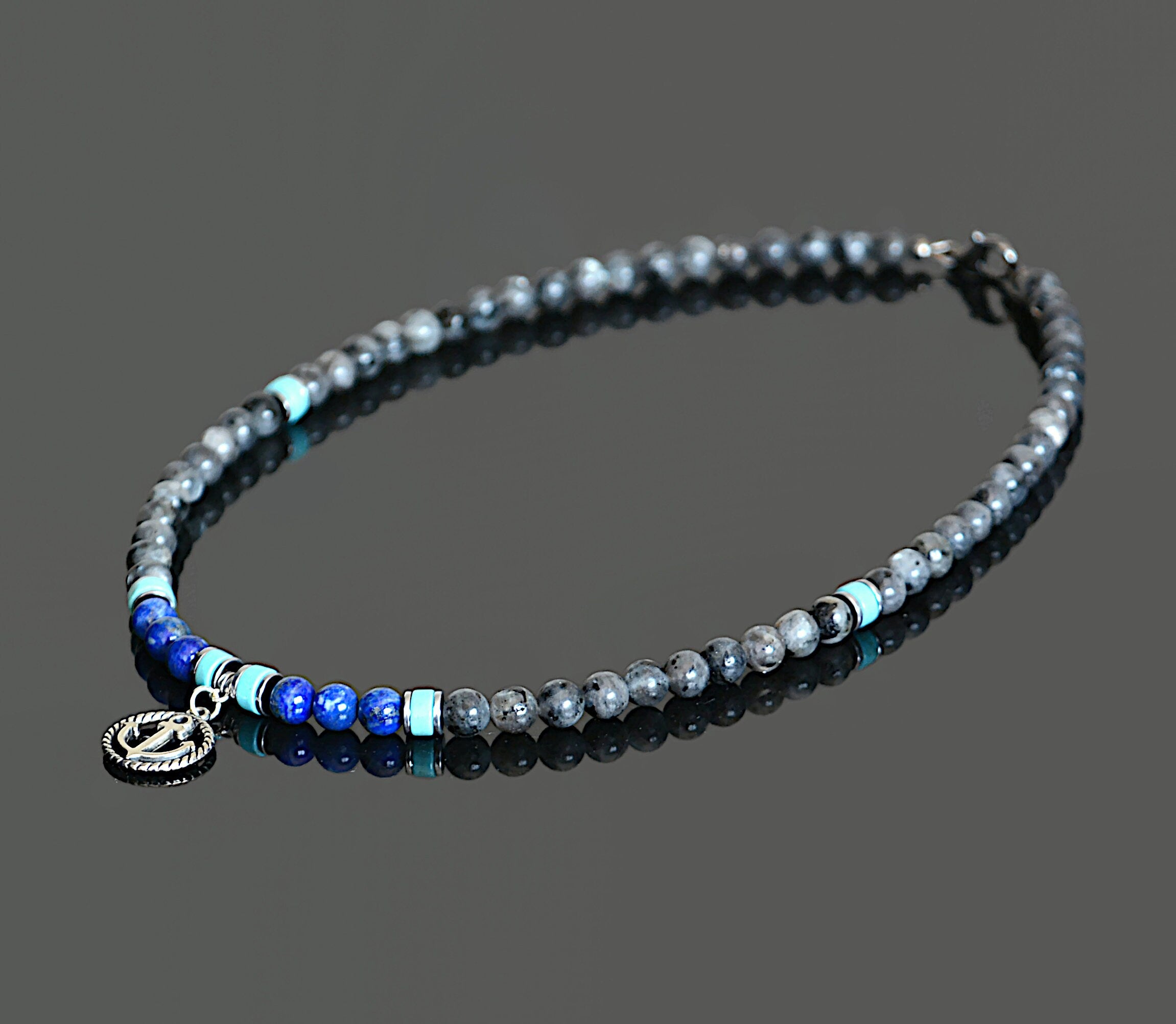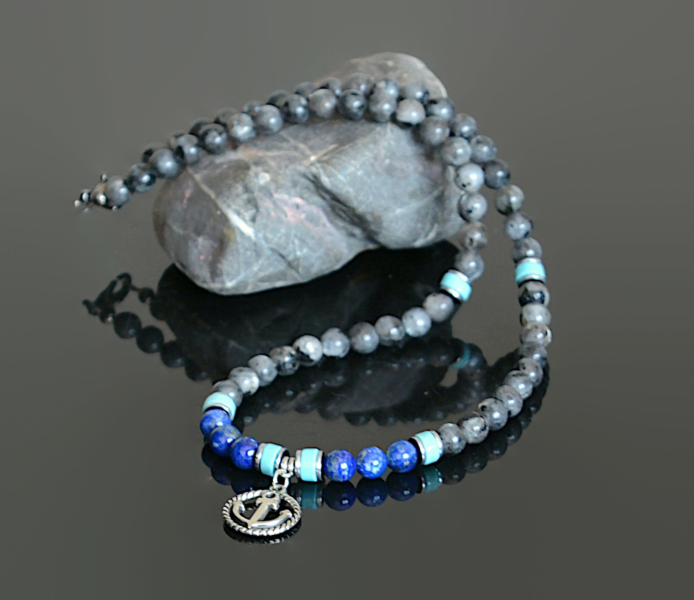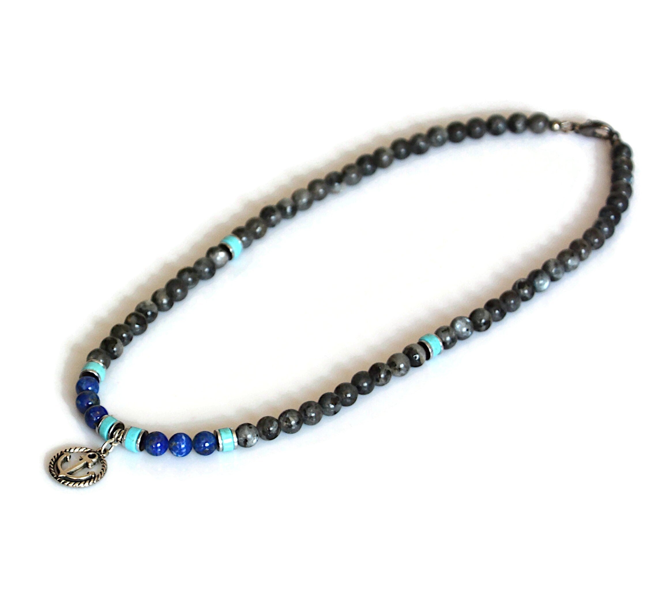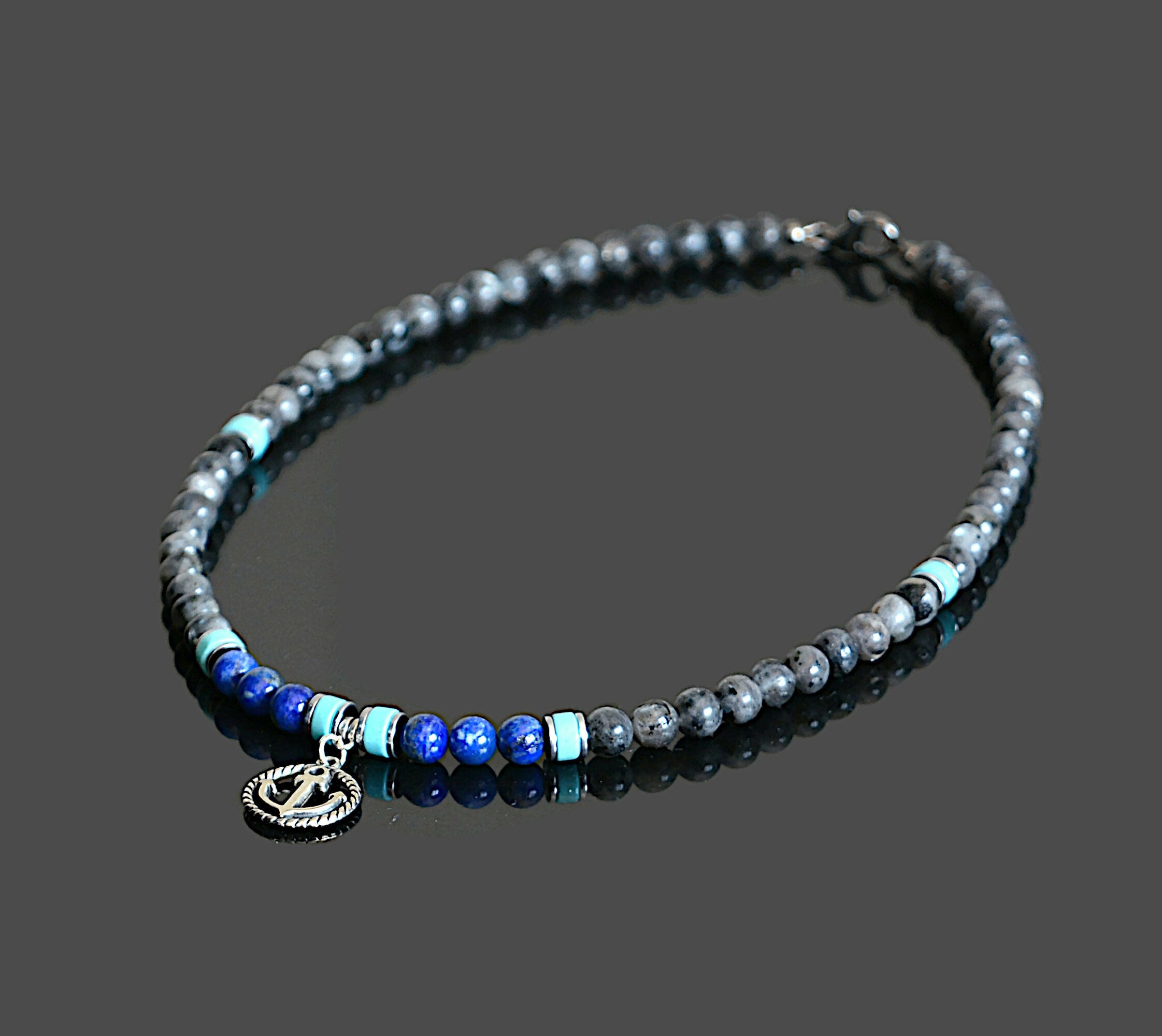 The necklace is accented with a nautical anchor charm and handcrafted with carefully selected beads in two shades of blue and a mystical gray, creating a bold yet refined coastal look. Whether you're drawn to its symbolic meanings, ocean-inspired style, or natural beauty, this necklace makes a thoughtful and meaningful gift for any man—especially for birthdays, holidays, or other special occasions.