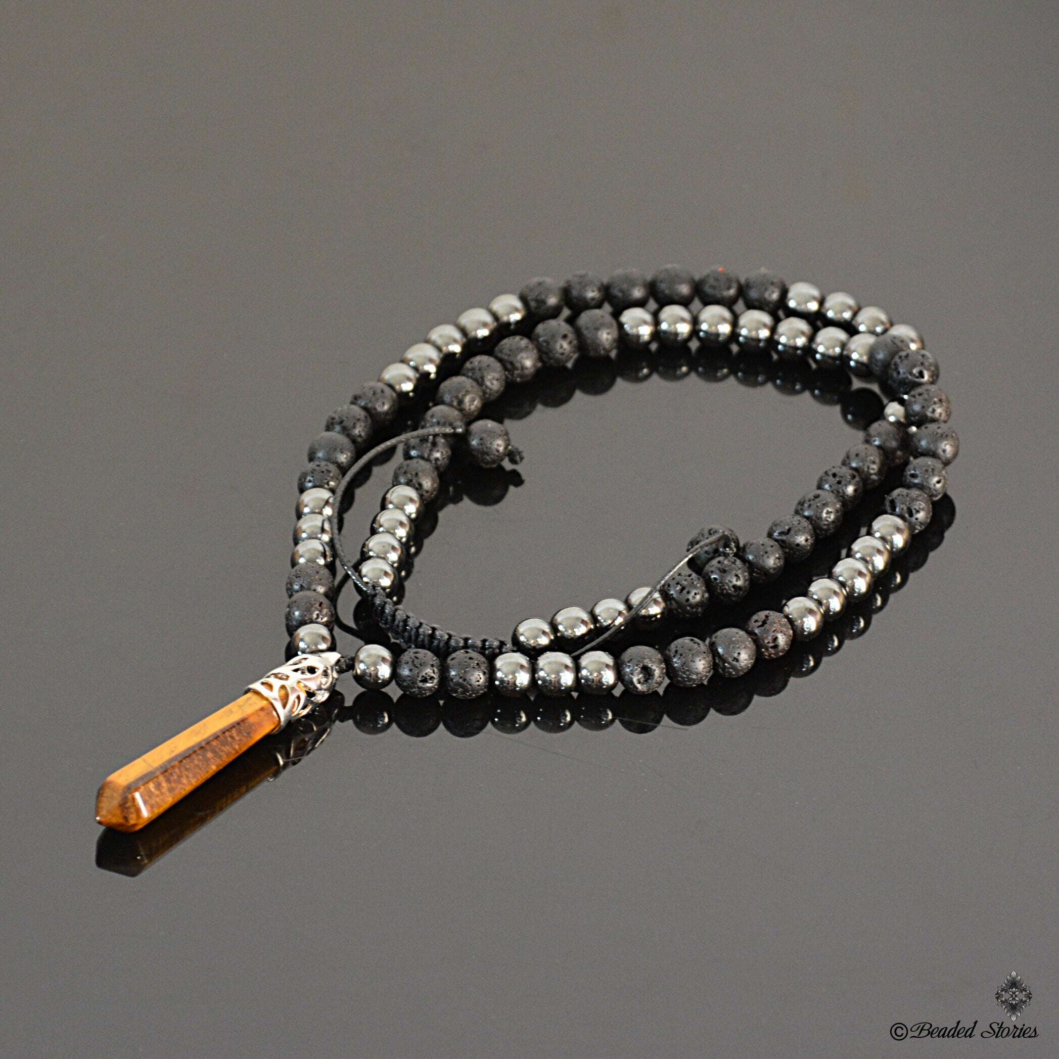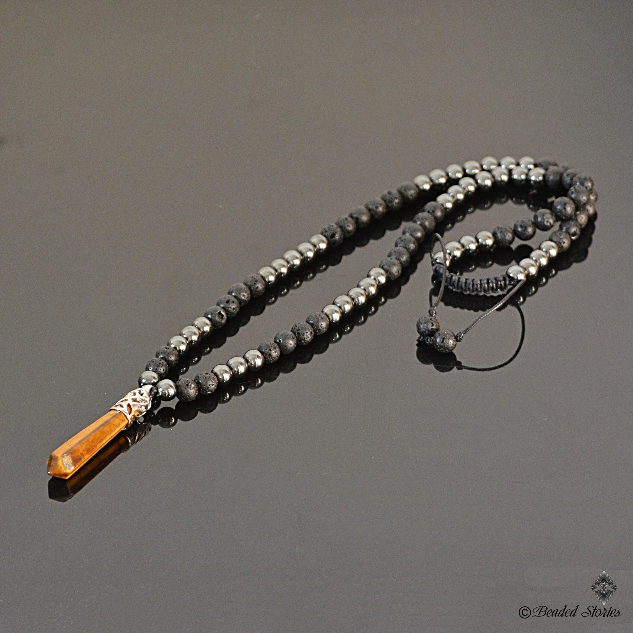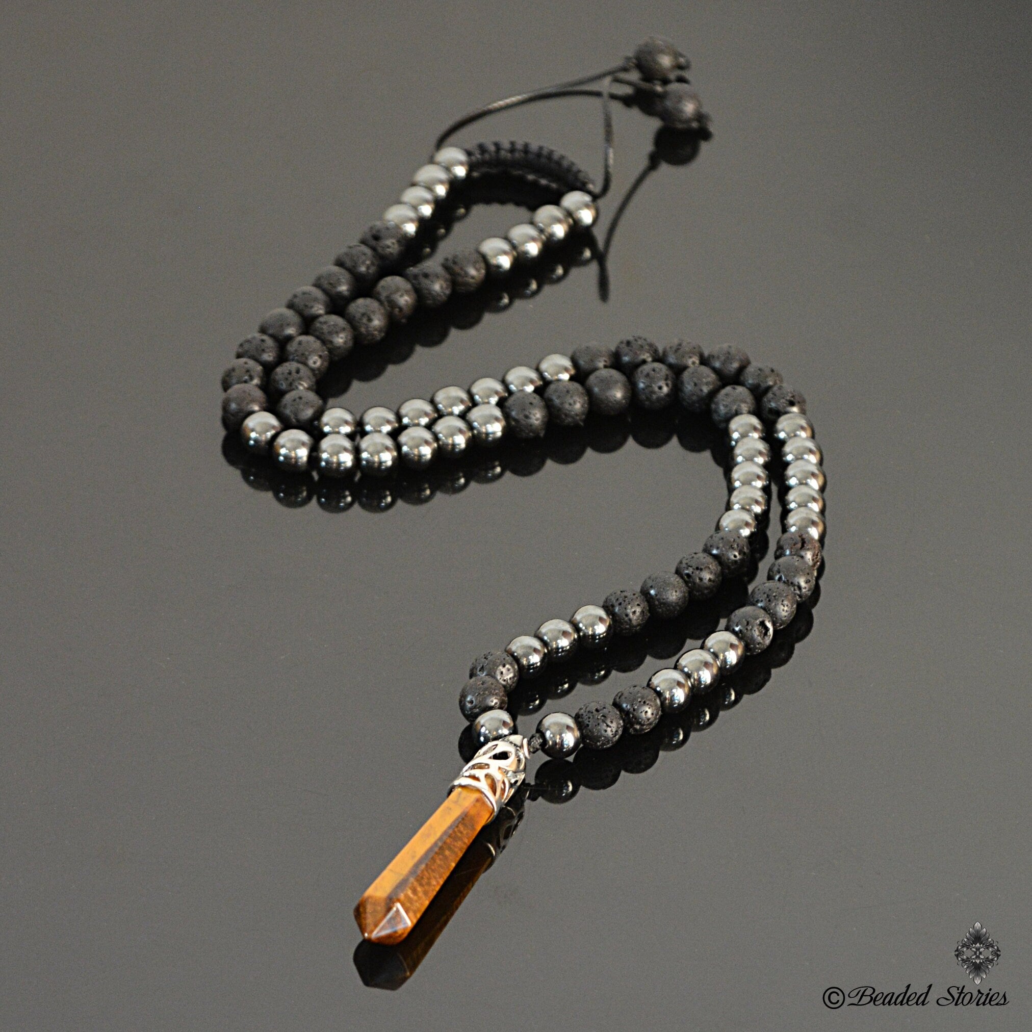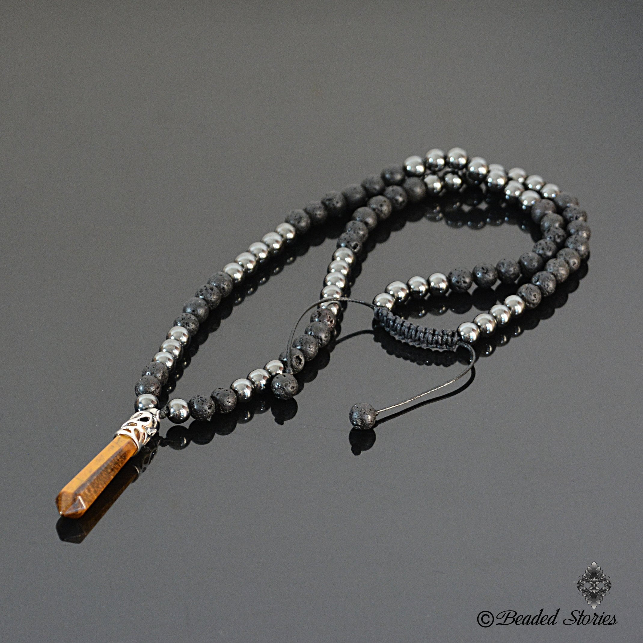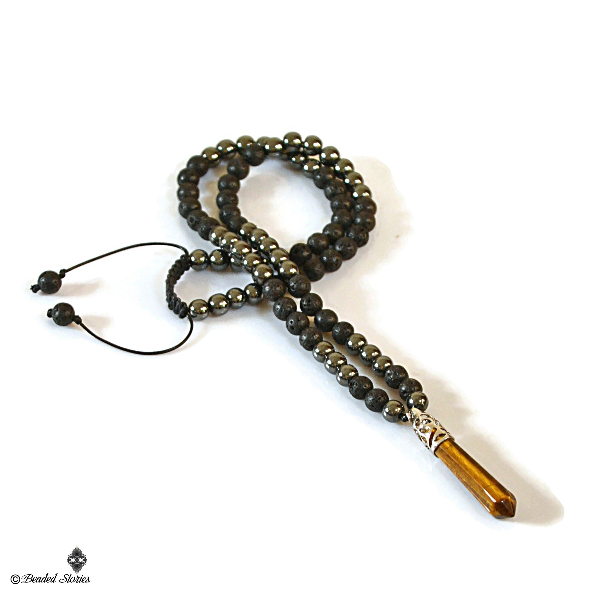 This handcrafted long beaded necklace for men features a bold, earthy mix of porous black Volcanic Lava and polished Hematite... Read more