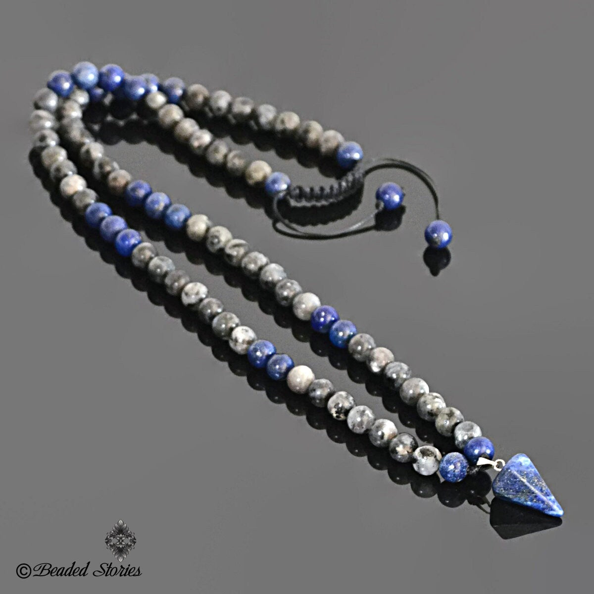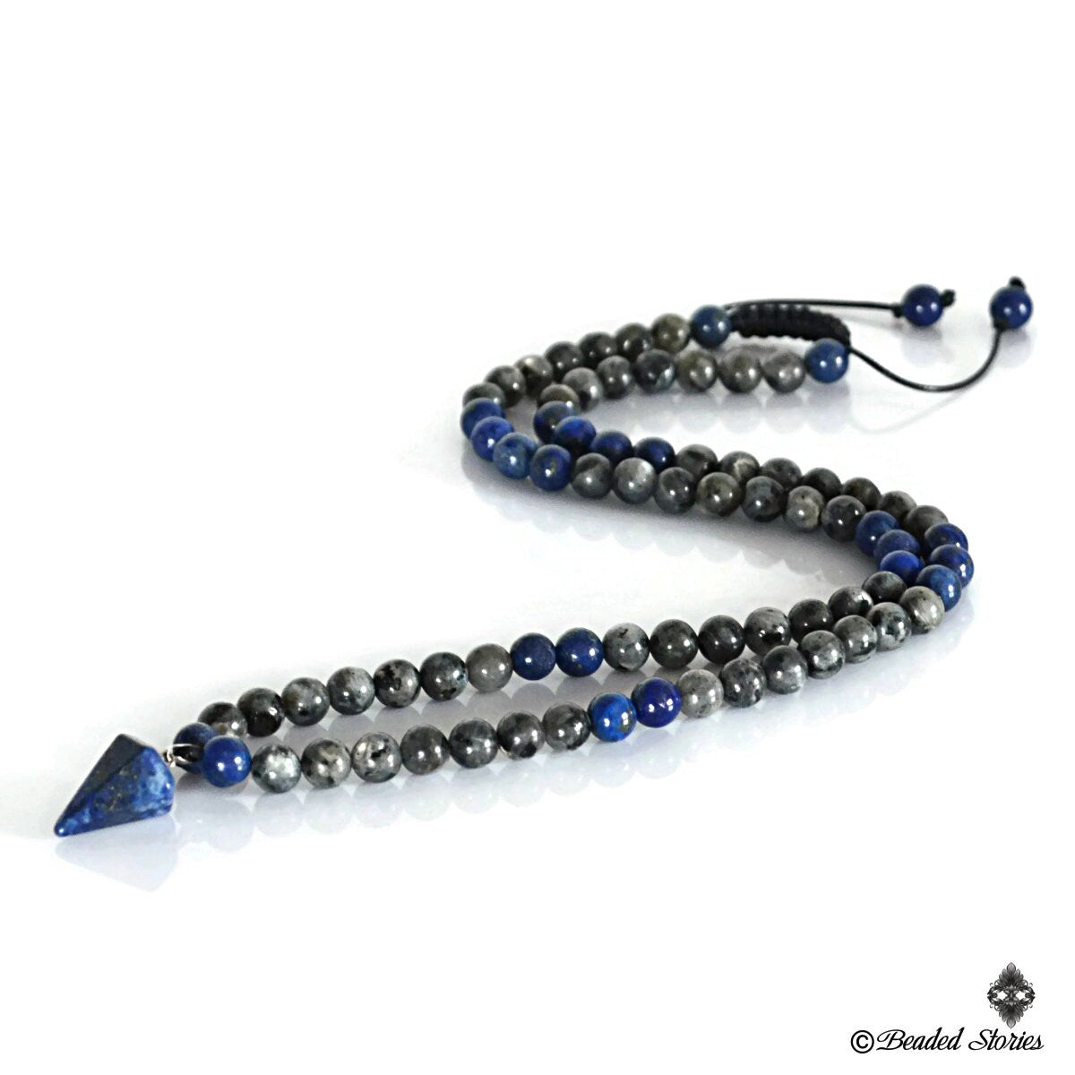 Expertly strung on a durable waxed cord, the necklace is adorned with a harmonious blend of Lapis Lazuli and Labradorite beads, carefully chosen for their spiritual and metaphysical properties. With an adjustable closure, it’s effortless to wear—slip it over your head or extend the length by up to 4 extra inches for a custom fit.