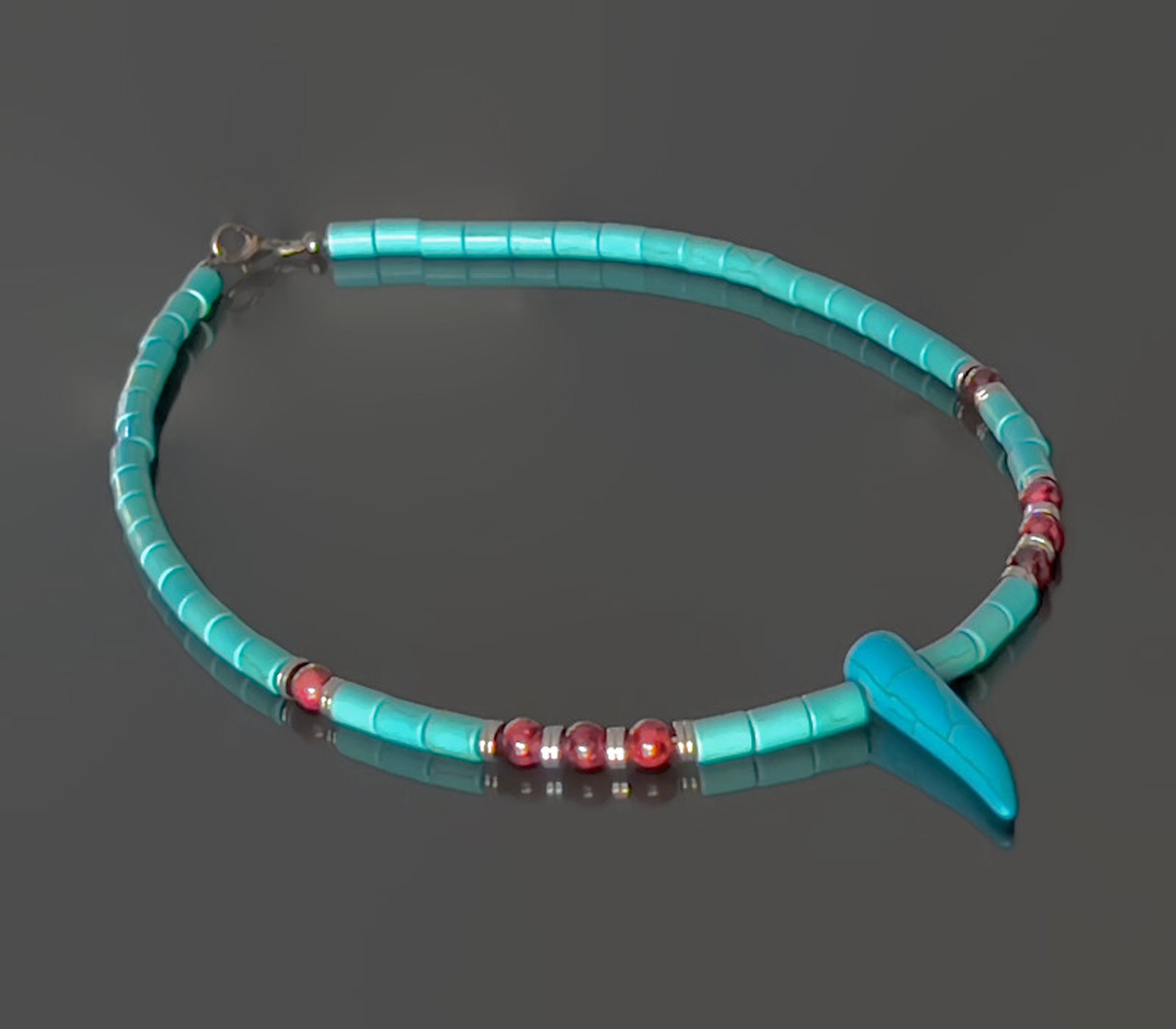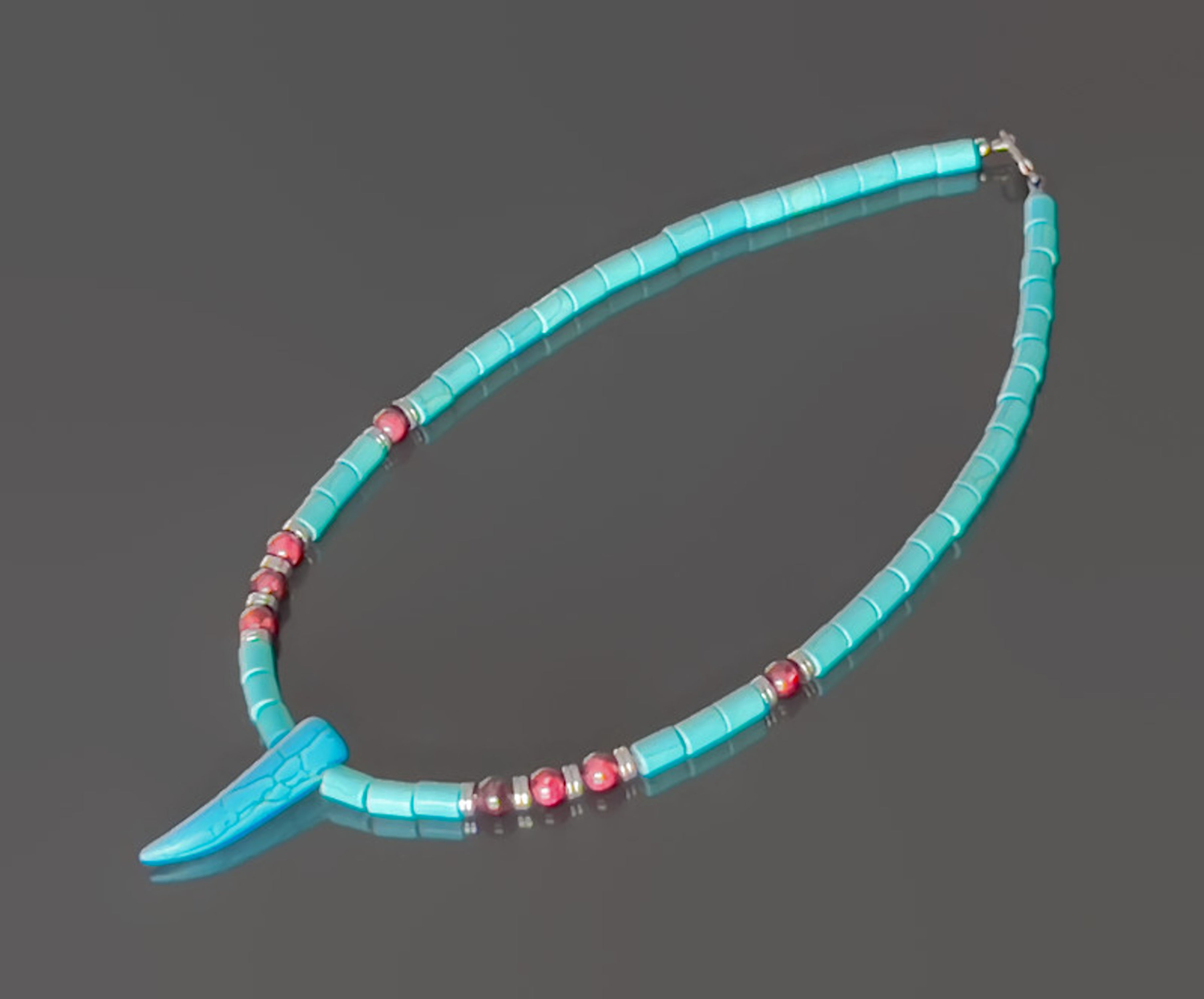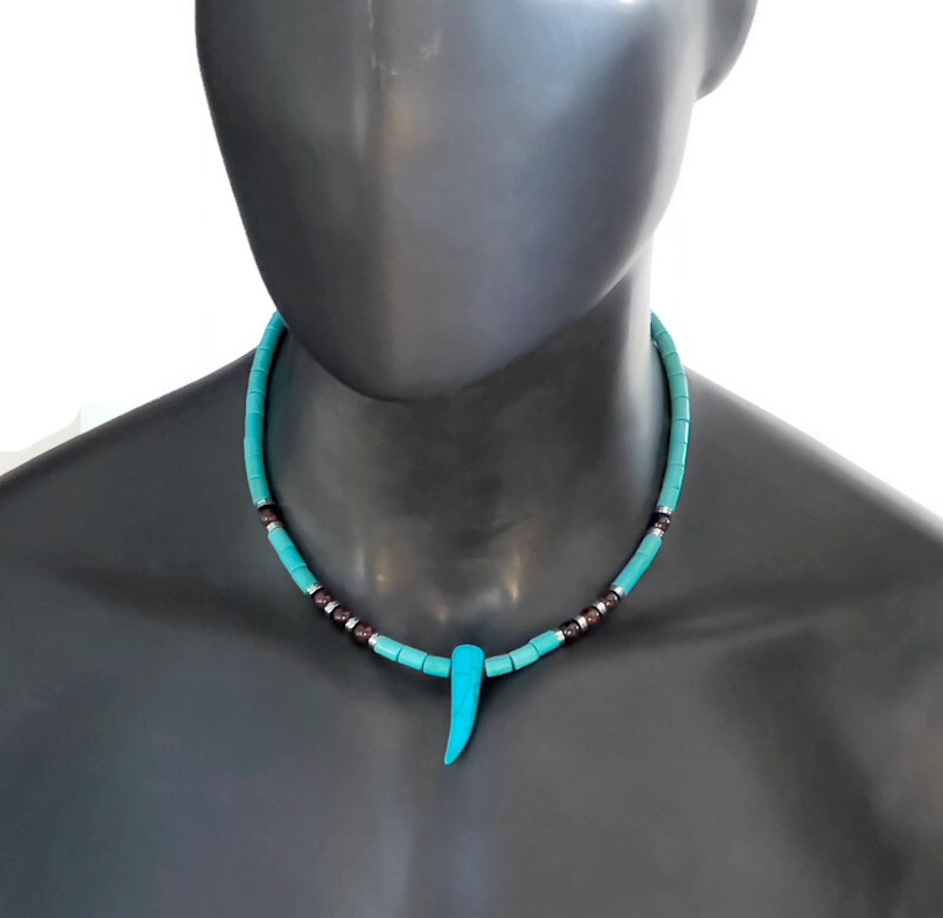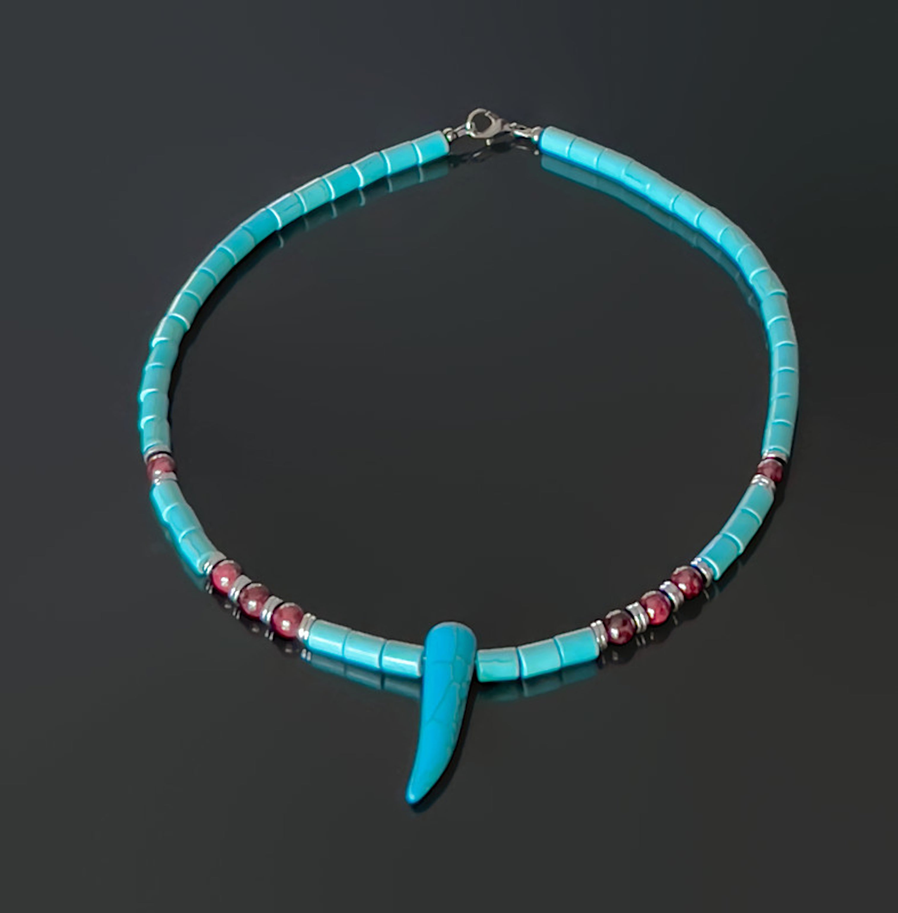 This handcrafted choker necklace combines style, symbolism, and comfort. Featuring a striking turquoise-blue Howlite horn pendant, accented with Howlite tube... Read more