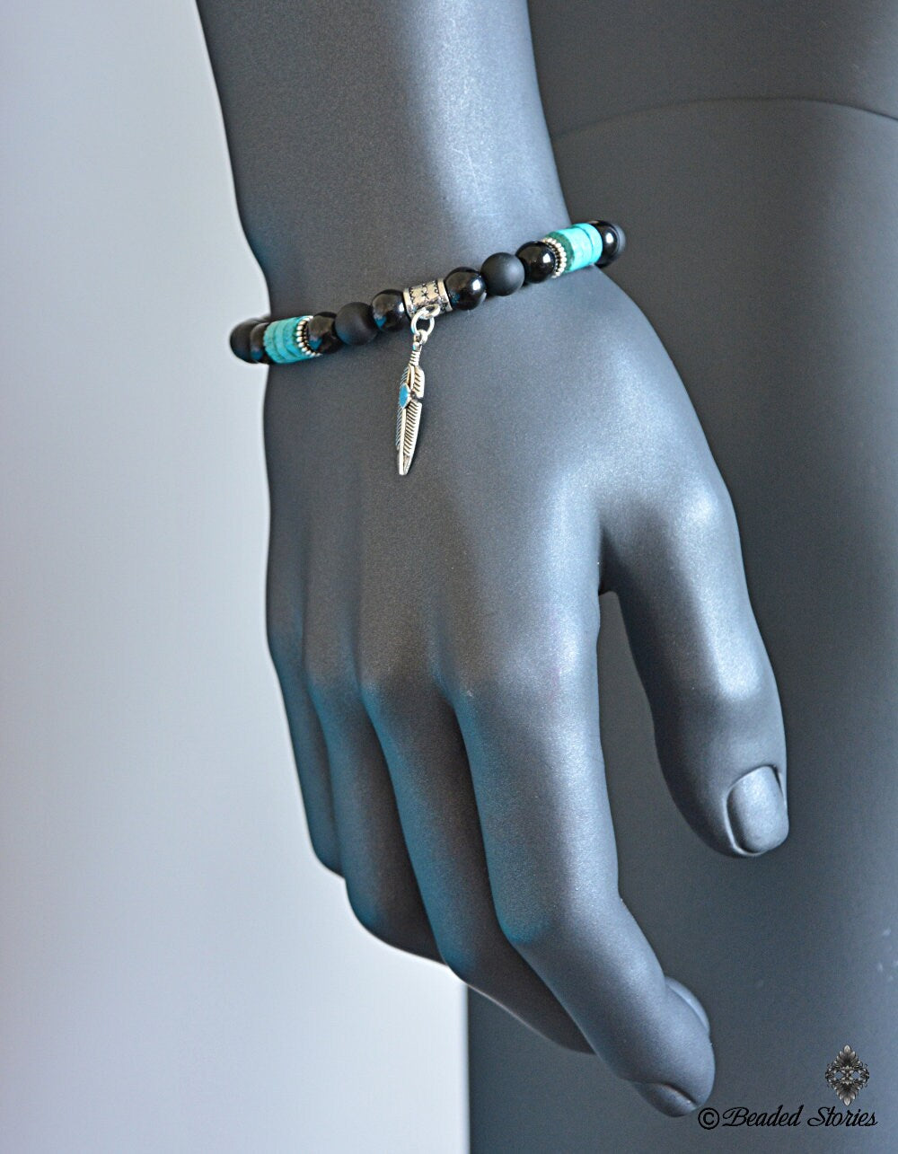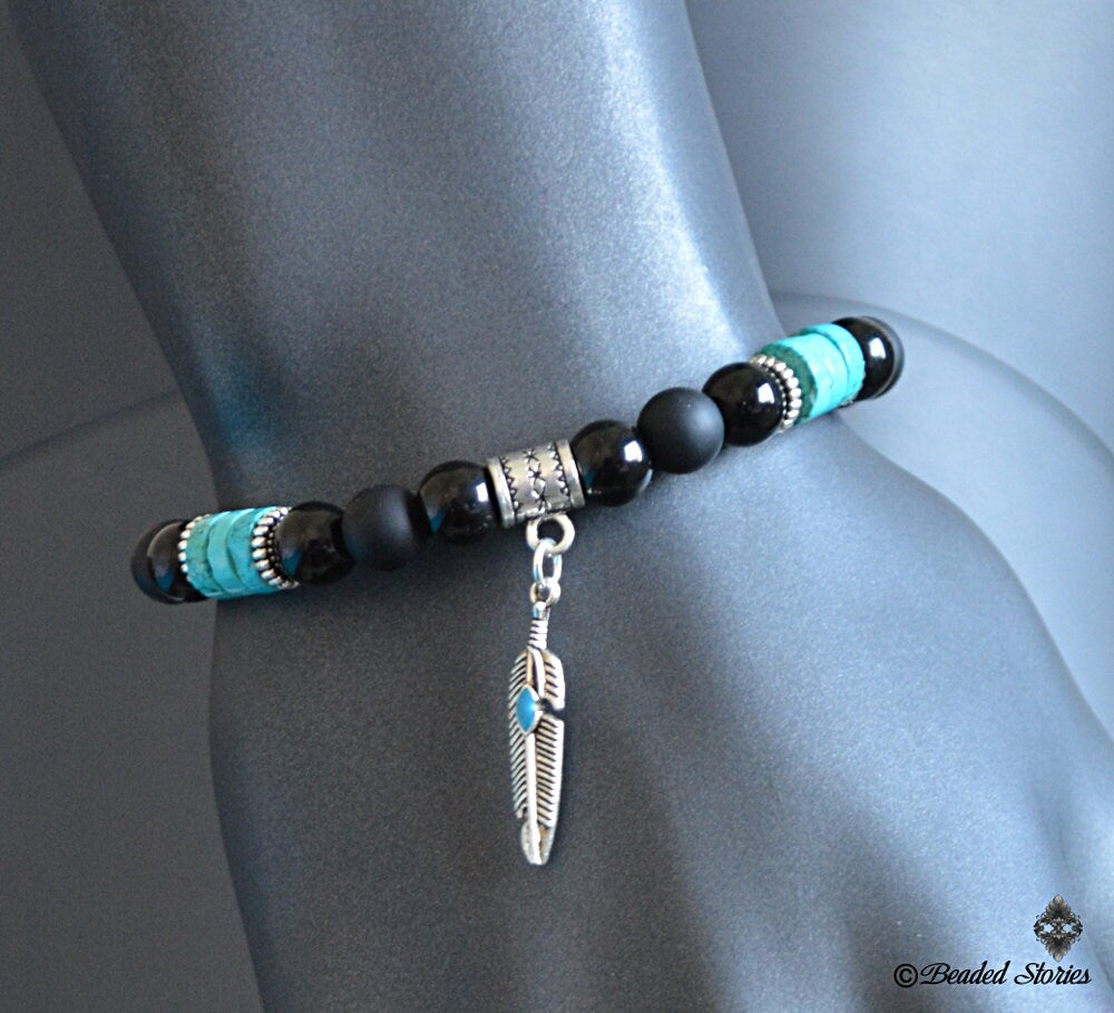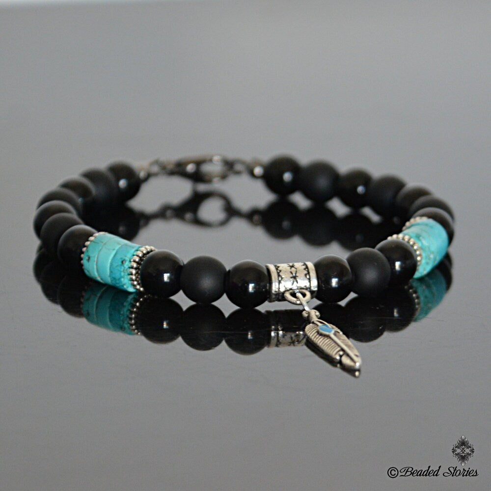Black Onyx & Turquoise Bracelet for Men, December Birthstone Jewelry, Gemstone Beaded Bracelet with Feather Charm